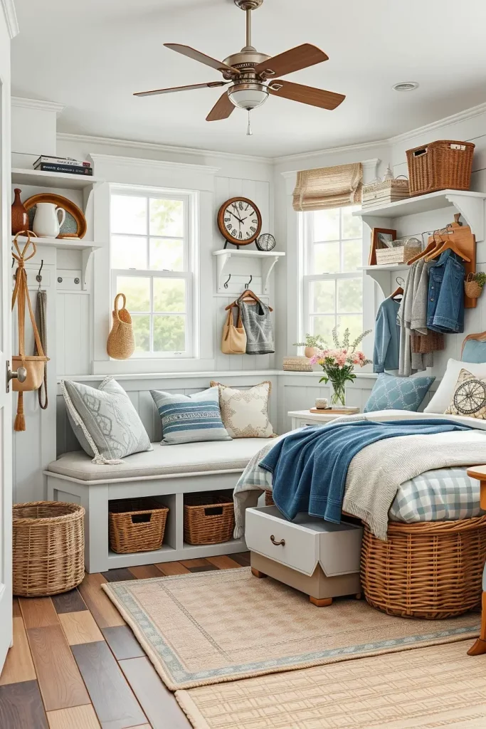 A small beach cottage interior faces continuous storage challenges yet this situation creates opportunities for creative solutions. I believe hidden storage solutions should be part of every design plan since they can be placed under beds and inside benches and behind doors. The key advantage of vertical space enables me to create open shelving and tall cabinets in my designs.
