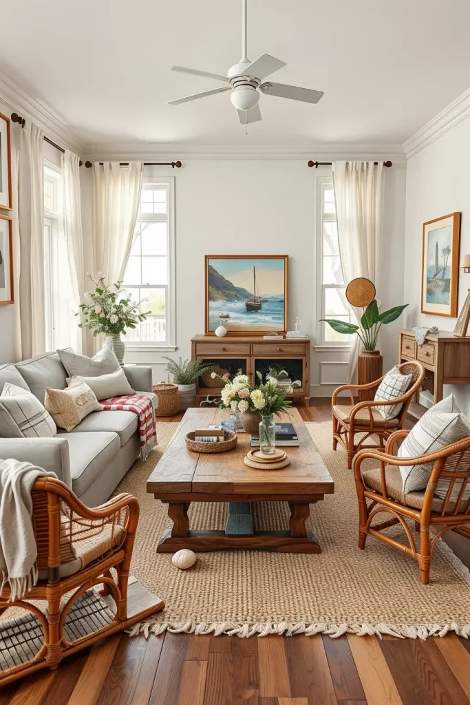 The furniture setup includes a low-profile linen sectional with a reclaimed wood coffee table combined with one or two rattan accent chairs. A relaxing coastal look is accomplished through minimalist artwork with simple textured blankets that avoid creating any cramped atmosphere.