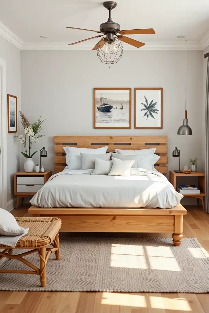 A wall-mounted reading lamp should be installed while coastal plants such as succulents or air plants would bring greenery to the space.