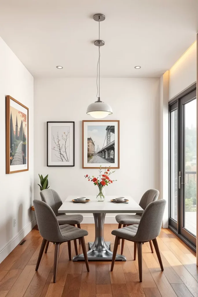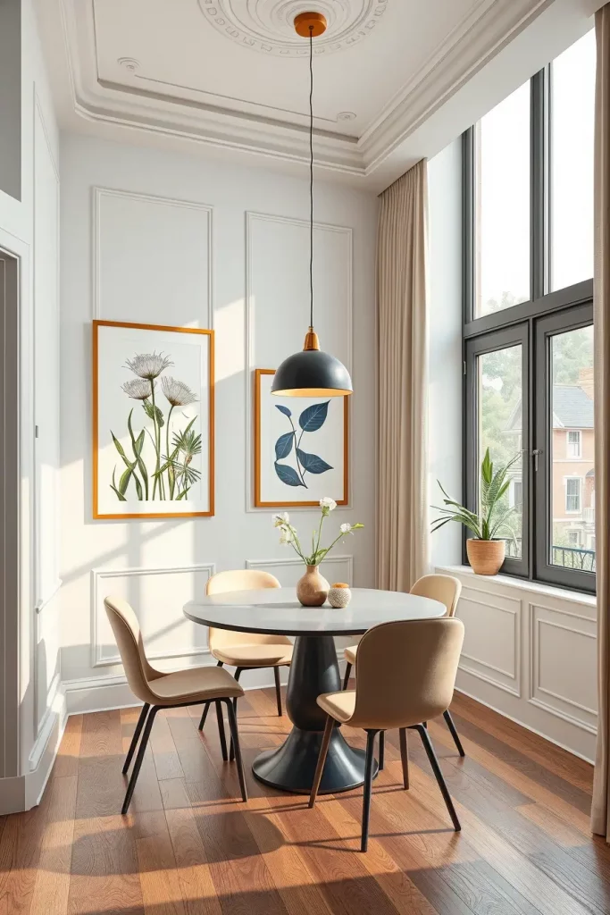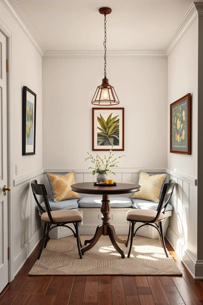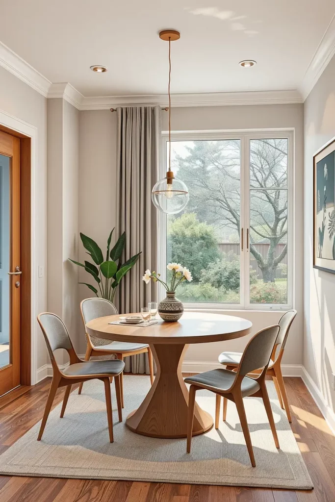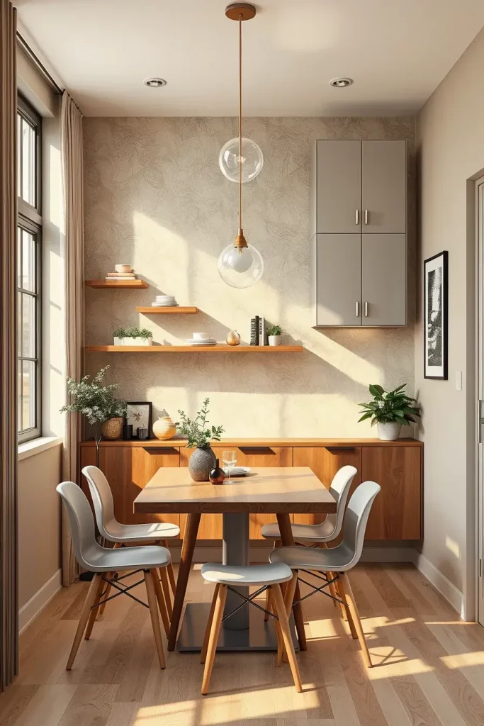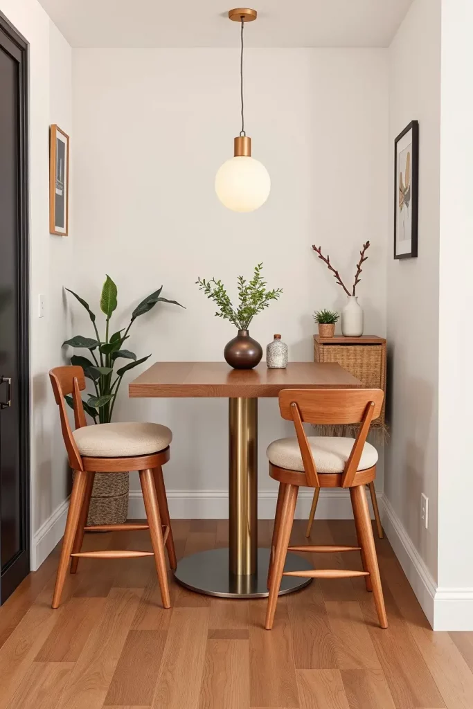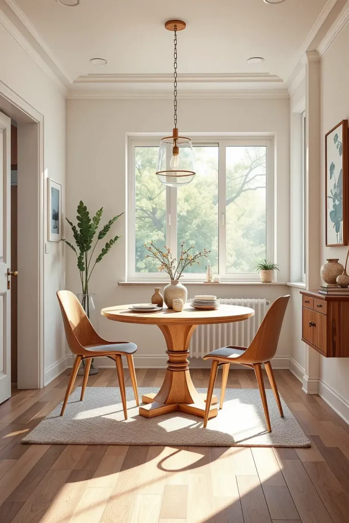 My choice is a small round or square table that fits perfectly into the corner space while using built-in or compact freestanding seating options. A corner bench combined with two side chairs enables seating for four people without blocking other room areas. Regular decor items set vertically above the dining setup such as mirror panels and hanging lights create a purposeful visual effect.