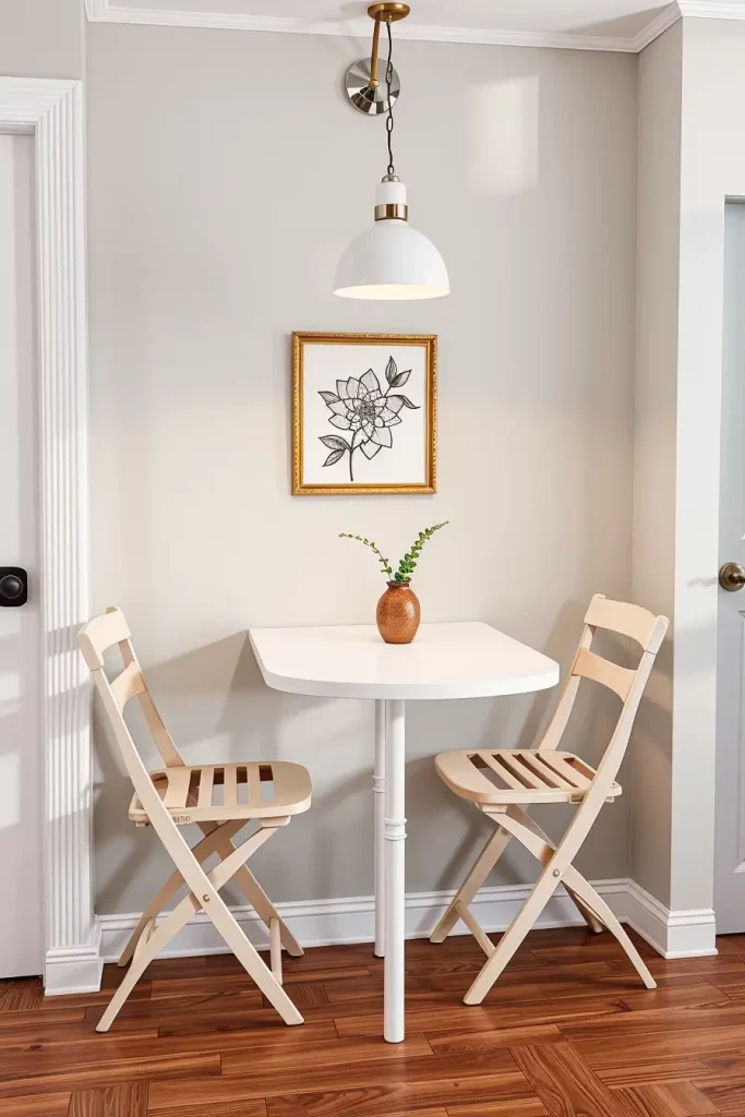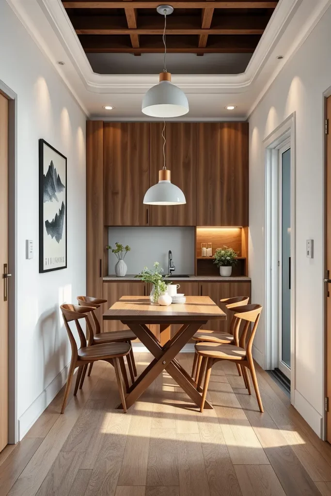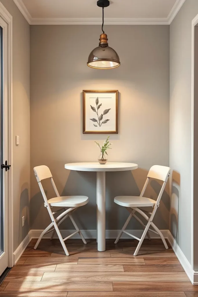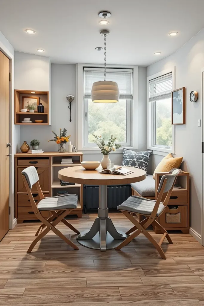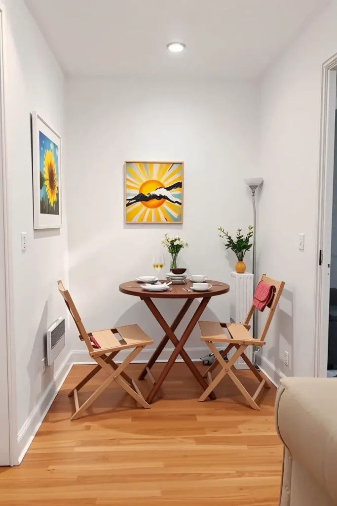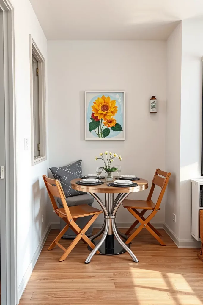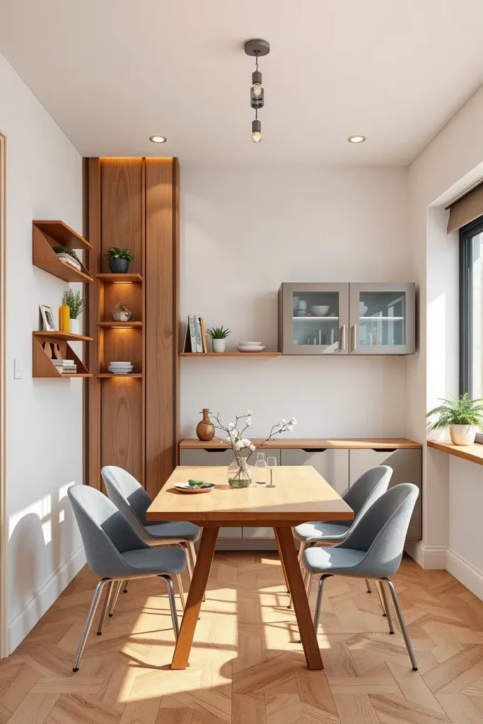 A small dining room requires absolute flexibility for its design. I frequently suggest using foldable dining tables to clients because of their flexible functionality. People who occasionally require additional dining space should consider foldable tables because they provide flexibility without daily table requirements. The tables offer two modes of operation: storage and compact size reduction which frees up space in the room.