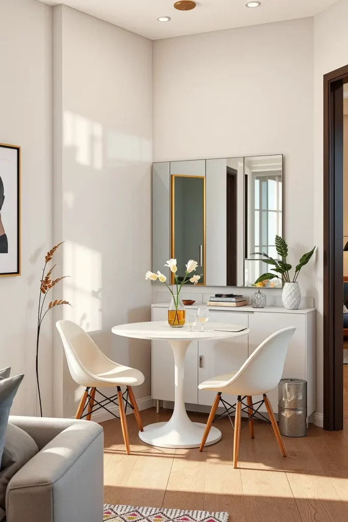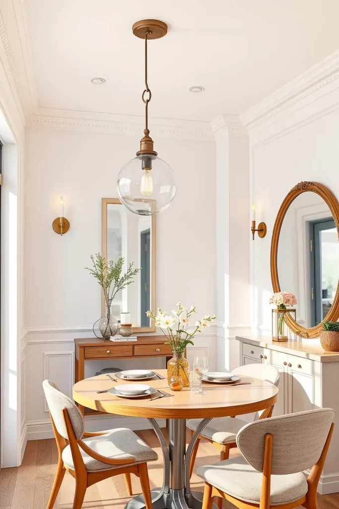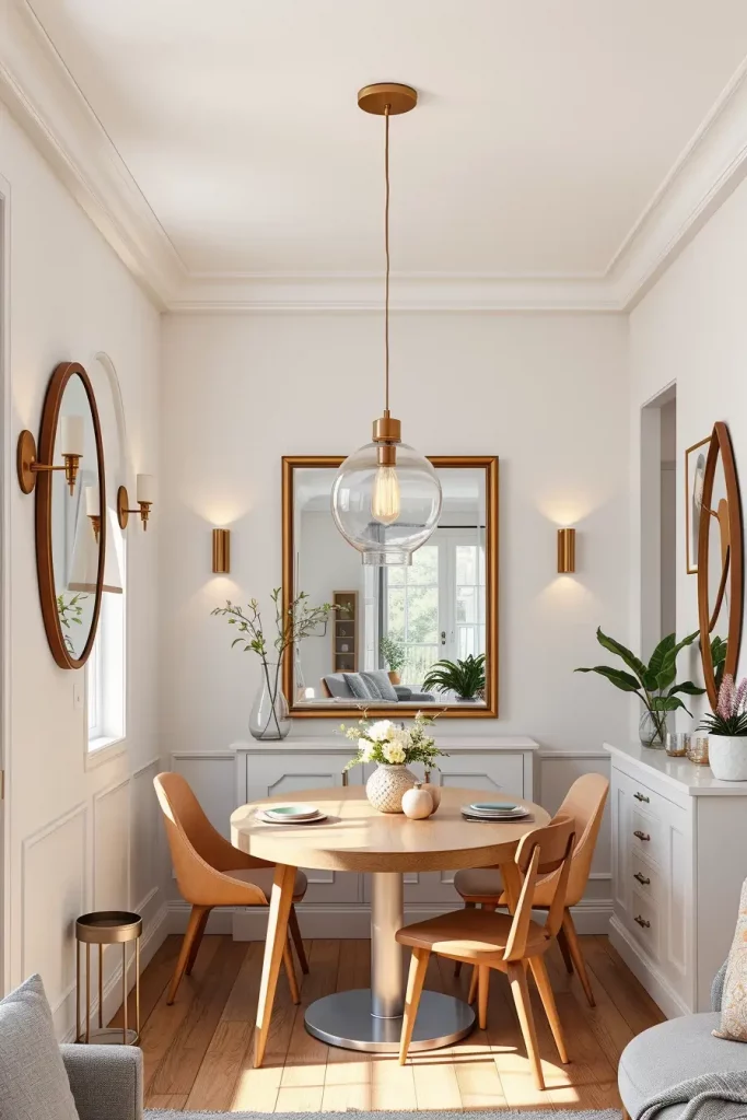Mirrors stand as my primary choice for enlarging the appearance of small dining spaces. Light reflection from these surfaces produces depth perception that expands the appearance of any enclosed space. My design approach includes using either a big mirror on one wall or arranging smaller decorative mirrors in a gallery arrangement.