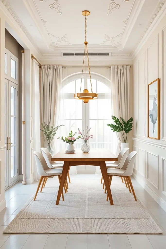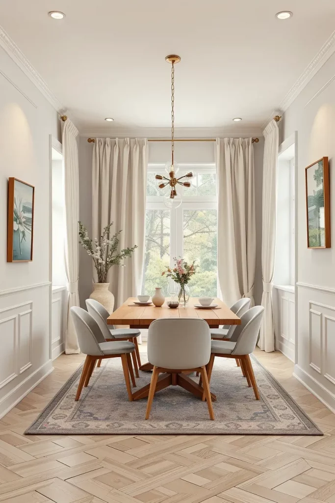 Use floor-length curtain panels that are white or neutral toned. Linen together with gauzy polyester blends function excellently while providing a natural flowing effect to sunlight. The room will appear spacious after sunlight enters through these curtains when paired with light-colored walls and minimal furniture that includes pale wood dining table and minimalist chairs.