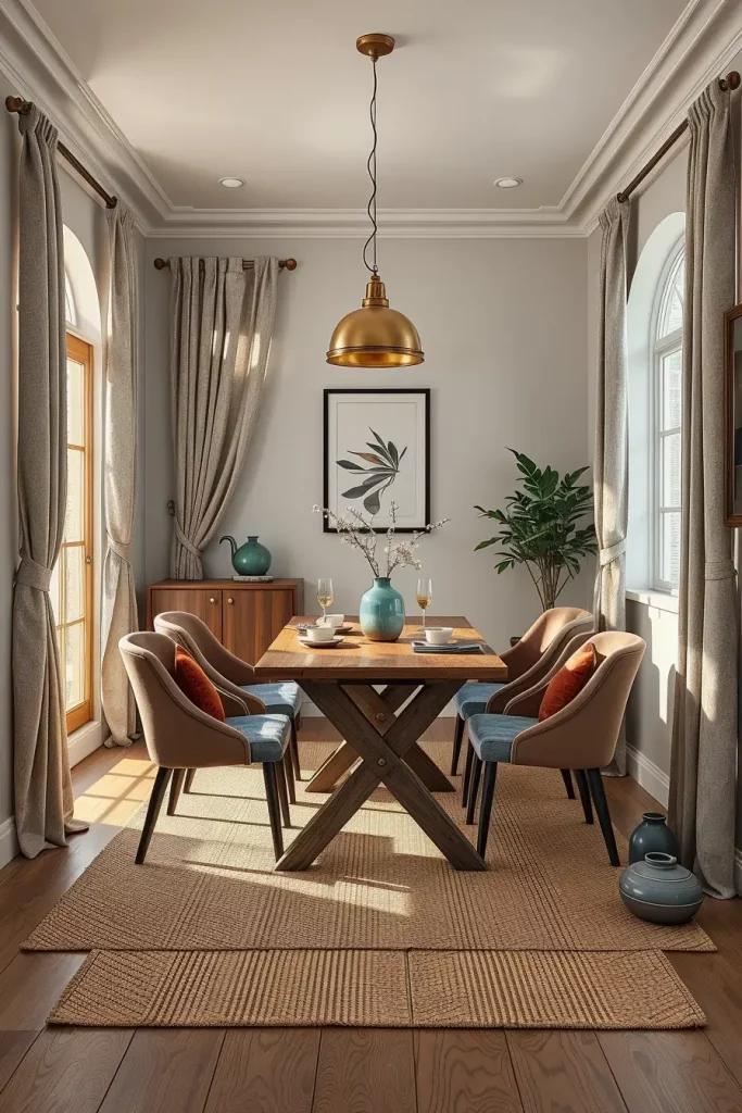 I prefer using natural wood tables combined with boucle or velvet dining chairs which rest on a woven jute rug. The stacked materials create visual appeal without overwhelming the space through excessive colors. A fabric panel or grasscloth wallpaper should be used on walls to expand the textured design. A ceramic vase or brushed brass light fixture provides adequate variety to any interior layout.