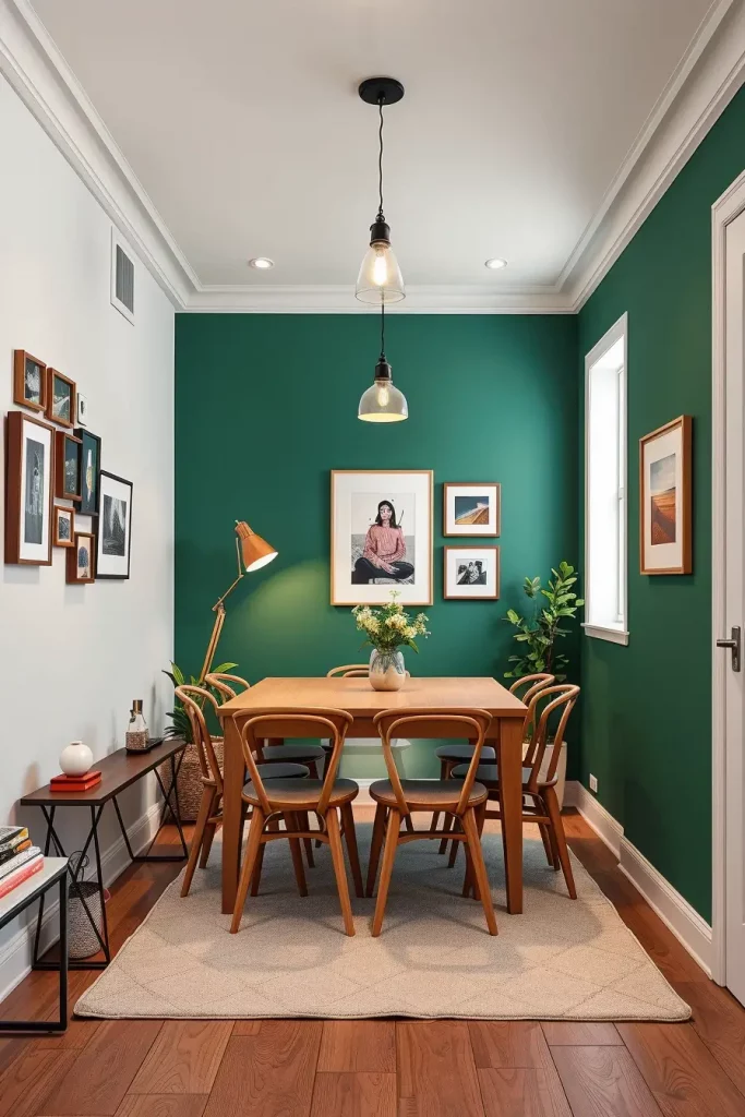 An accent wall serves as an excellent method to infuse personality into spaces while utilizing no actual floor area. A small dining room benefits from this feature because it functions as both a visual anchor and depth creator. One wall selection becomes essential for me to paint with dramatic colors or wrap in eye-catching wallpaper as this simple effort creates outstanding visual effects.