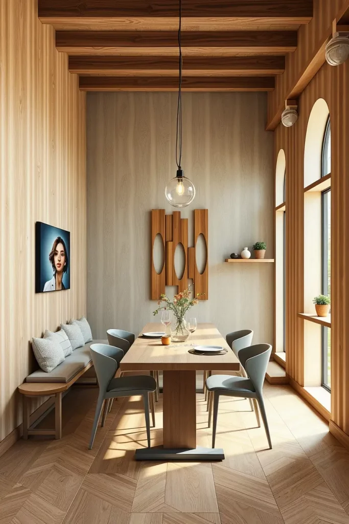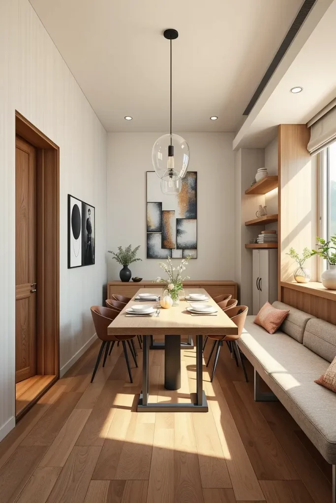 The combination of vertical wall panels with narrow runner proves to be an effective space-maximizing solution in my design work. The editors at Better Homes & Gardens explain that extended dining tables naturally partition rooms without requiring walls for separation. I choose a simple pendant light which hangs above the center point to create an anchor effect that prevents space from feeling cramped.