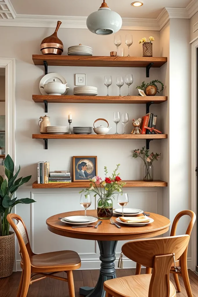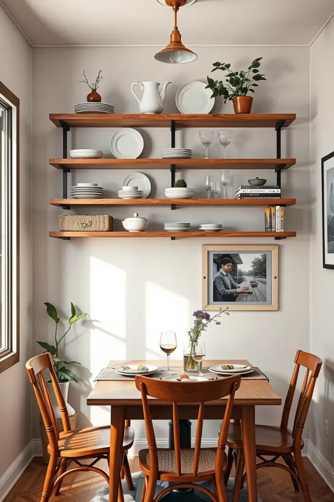 I prefer to install wooden or metal floating shelves at 16–24 inch heights that rest above sideboards or tables. Conduct your shelf installation using bracket or floating styles whose finish matches your dining table for visual consistency. The shelf contents should include functional and decorative items such as plate stacks and clear glassware and small cookbooks.