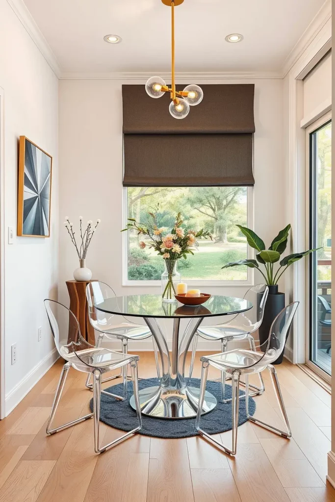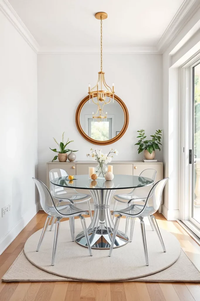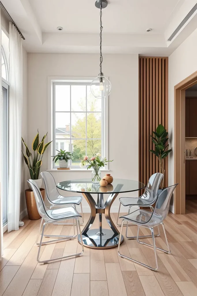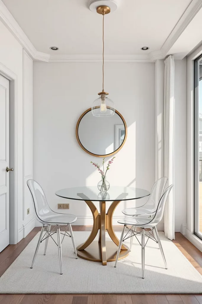 The visual appearance of lightness holds equivalent importance to actual space dimensions in small rooms. I incorporate transparent furniture throughout my designs for small dining rooms because of its ability to create an open atmosphere. The room obtains an open and airy atmosphere through transparent acrylic or glass furniture that allows unimpeded light transmission. The immediate elimination of visual clutter through this technique creates an open atmosphere in the room.