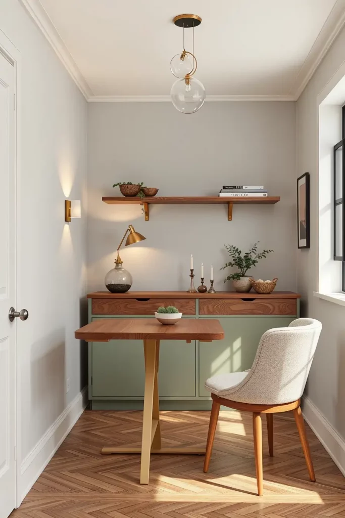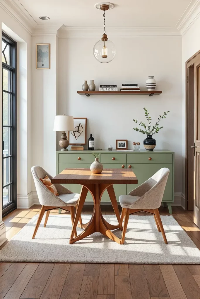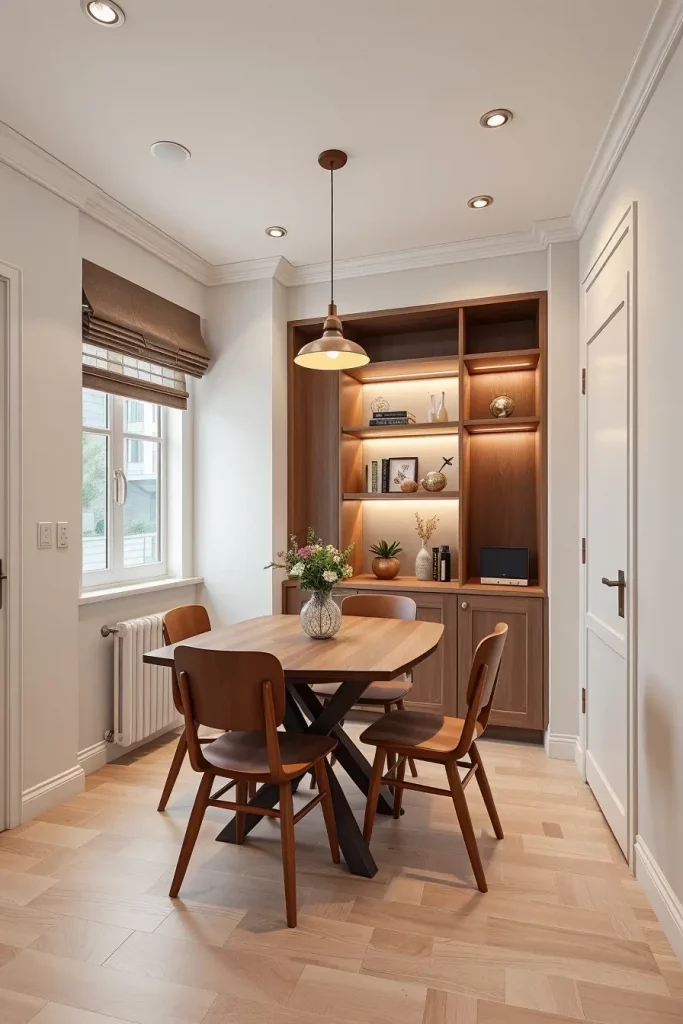My preferred sideboards and buffets have a maximum depth of 14–16 inches while using closed cabinet doors to maintain a smooth appearance. Small rooms look best with light wood surfaces or pale paint finishes such as navy blue and sage. I organize these storage elements together with floating shelves in order to achieve the best vertical storage benefits. The rounded edges on furniture reduce its angular appearance while providing better mobility through tight dining corridors.