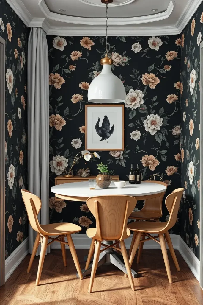 Small rooms can pull off daring wallpaper patterns without any problems. I find pleasure in adding eye-catching patterns to the limited dining spaces of my clients. The application of floral or geometric wallpaper will convert an ordinary corner into a brilliant design feature. The appropriate use of this design technique produces energy-filled areas that previously lacked visibility.