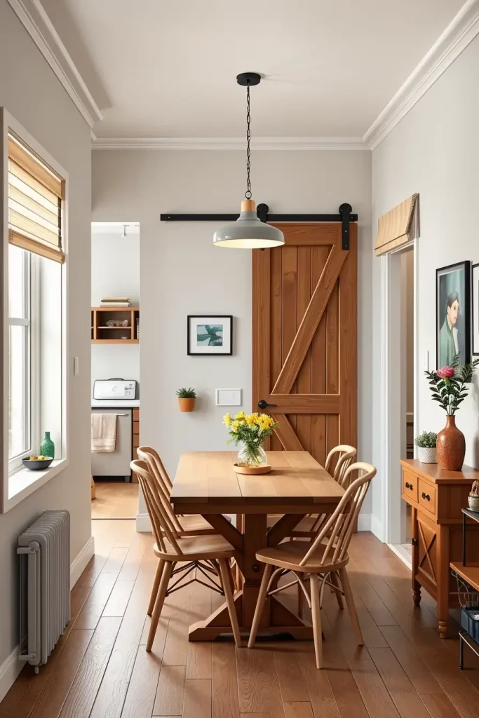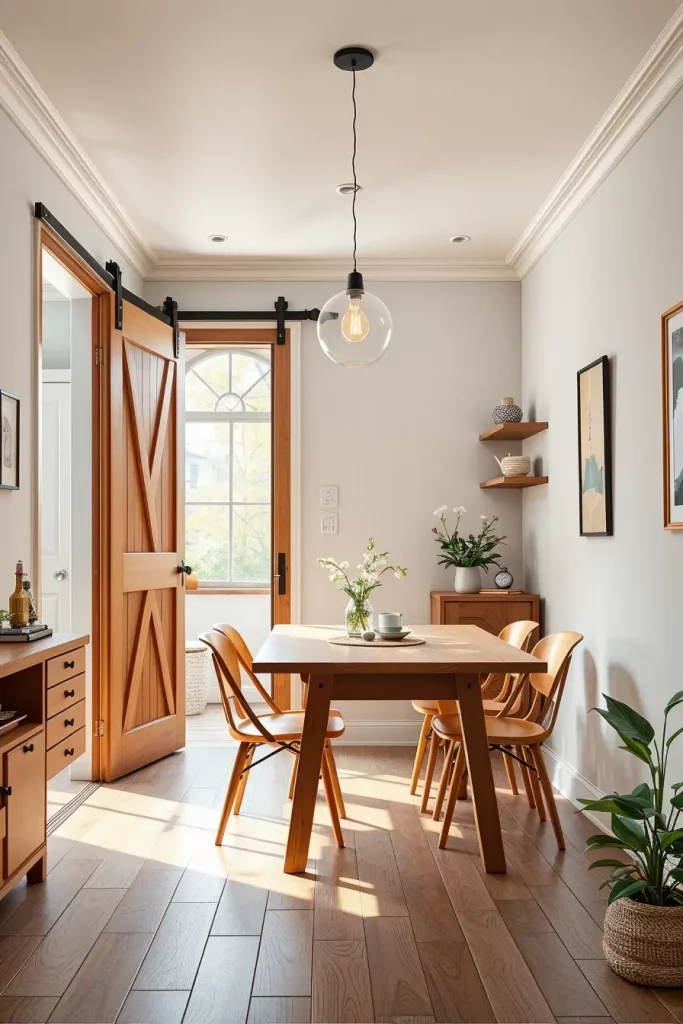 The square footage in tight spaces gets diminished by traditional doors which is why I typically replace them with sliding doors for small dining rooms. The immediate effect of this modification creates space which enables better furniture organization. The design of each home determines which door type I select from pocket doors to barn-style doors.