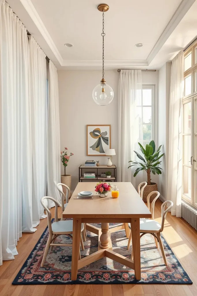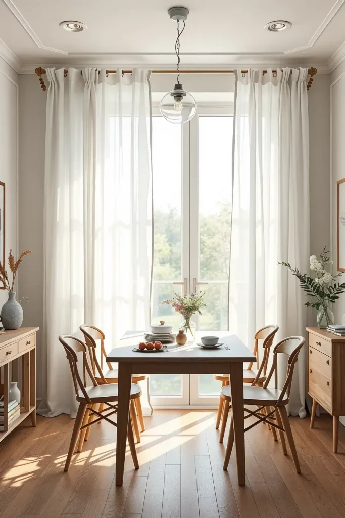 Sheer curtains serve as an effective solution to maximize natural light in small dining rooms since they let sunlight pass through while maintaining privacy. Numerous clients who selected heavy drapes for their windows experienced a boxed-in feeling until they replaced them with sheer lightweight fabrics.