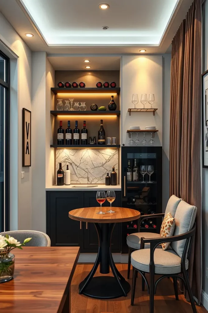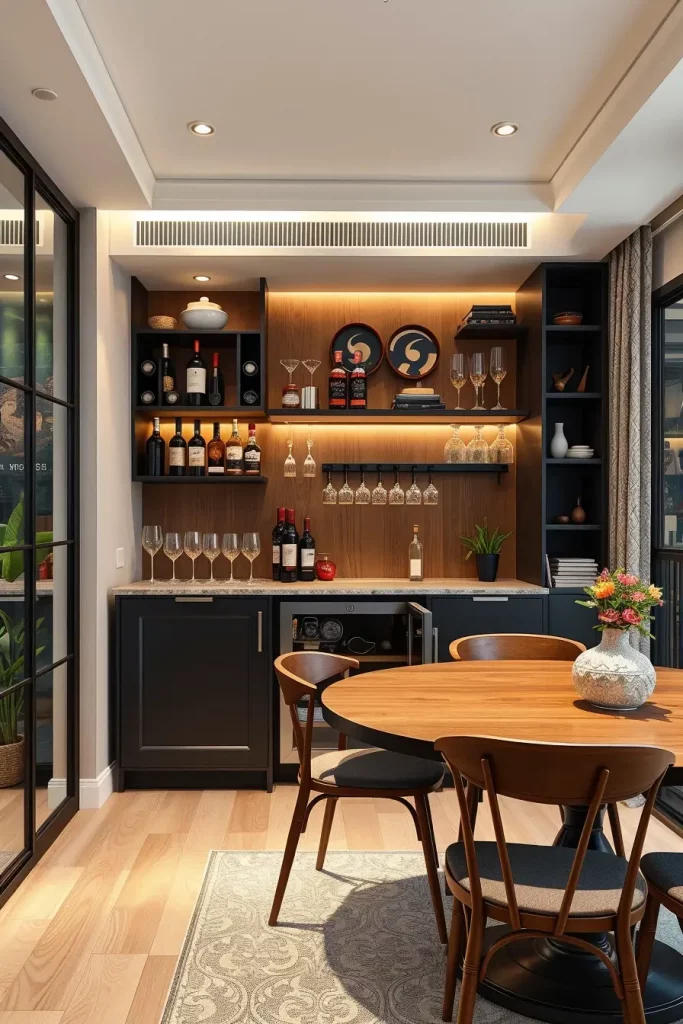The storage space gets more efficient through hanging wine racks and under-shelf glass holders that increase vertical capacity. The bar area should only feature a few elegant bar tools or vases to maintain its clean purposeful appearance.