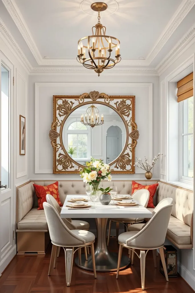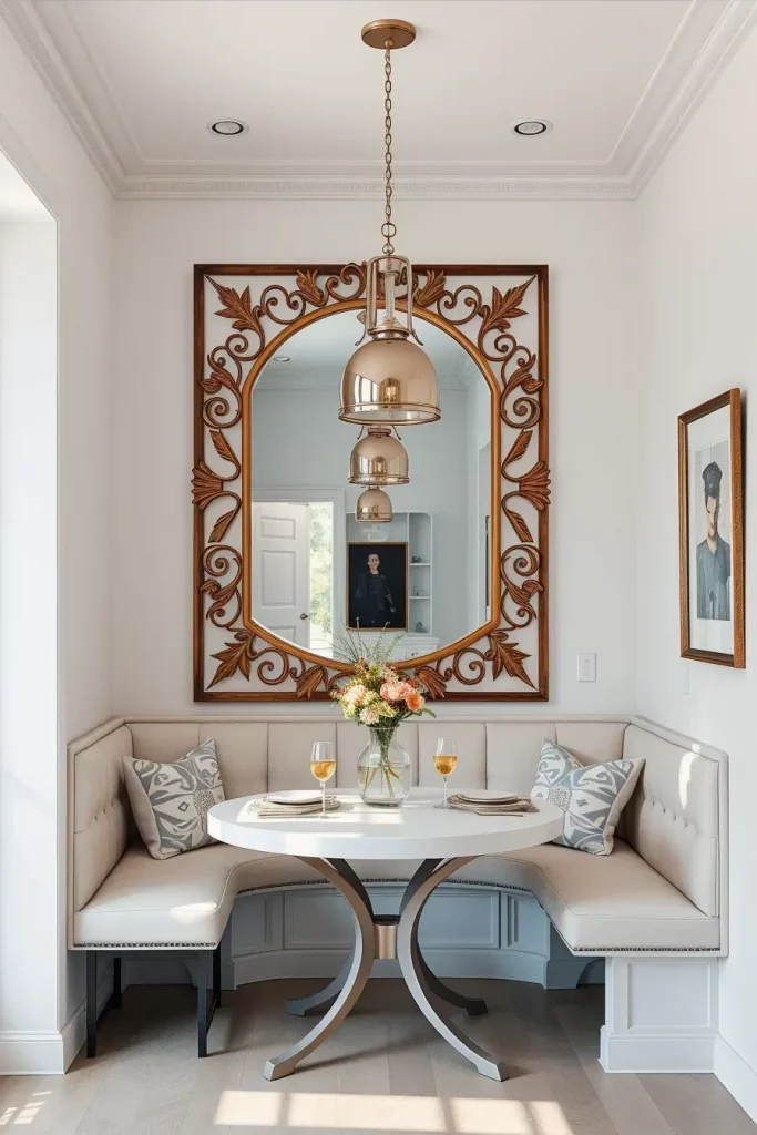 I applied a vintage-styled reflective surface behind a banquette bench for my latest project. The room gained double its original size through this addition which also brought elegant sophistication. The area gained both visual brilliance and metaphorical radiance when light colors and metallic accents were used together. The vertical expansion of a space becomes possible through the use of floor-to-ceiling mirrors.