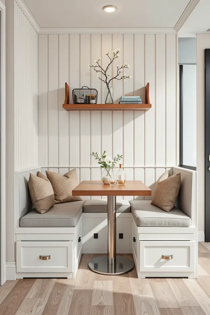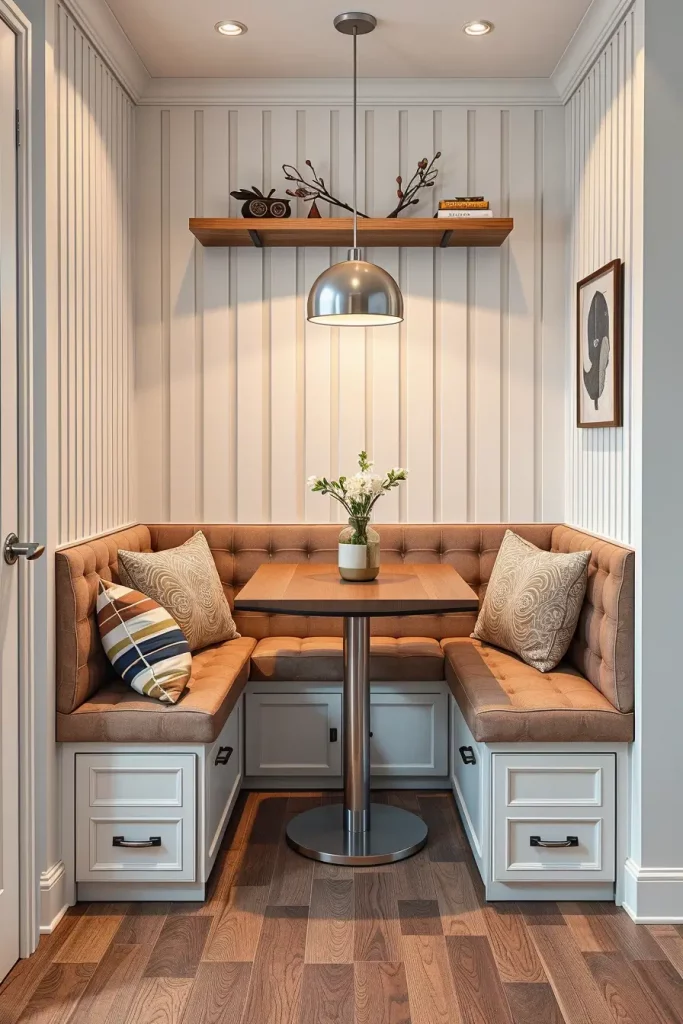 A narrow shelf positioned above the seat serves as a great addition to display artwork or books while enhancing the overall appearance of this design. The design reaches completion through this addition which also allows you to personalize your dining nook.