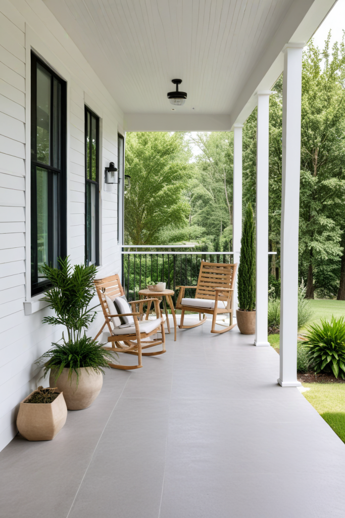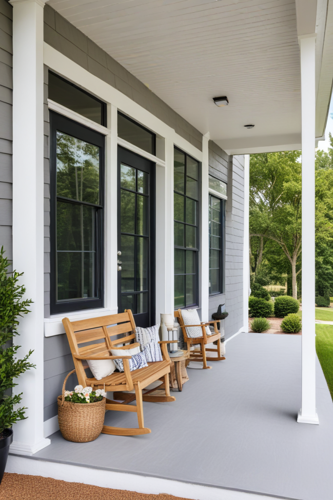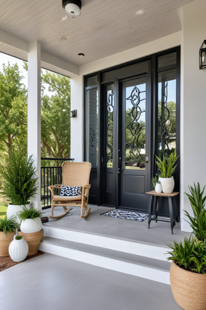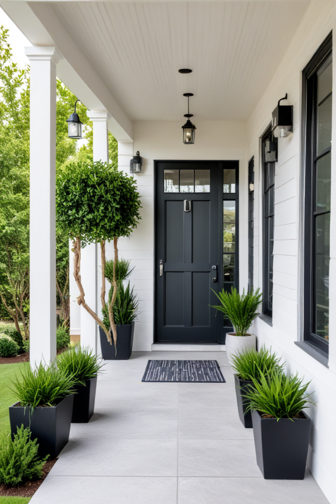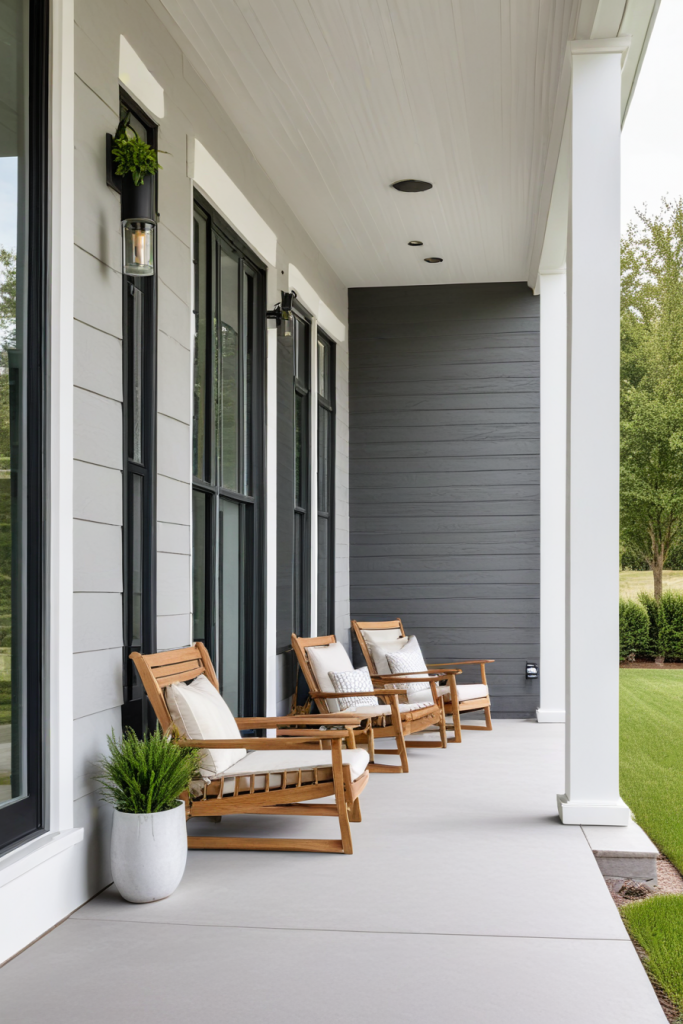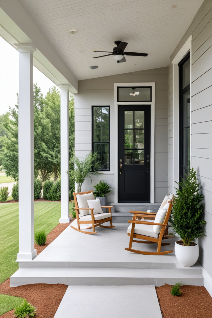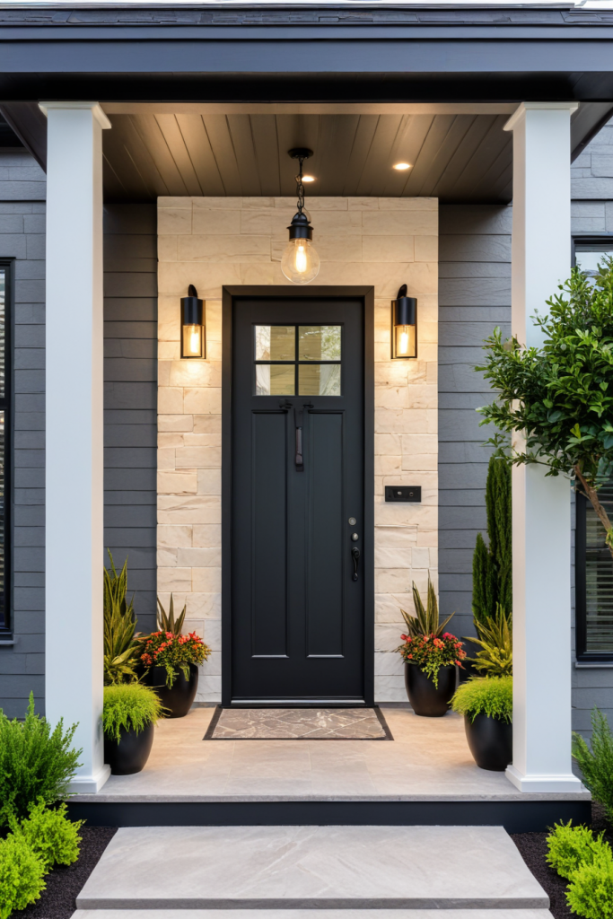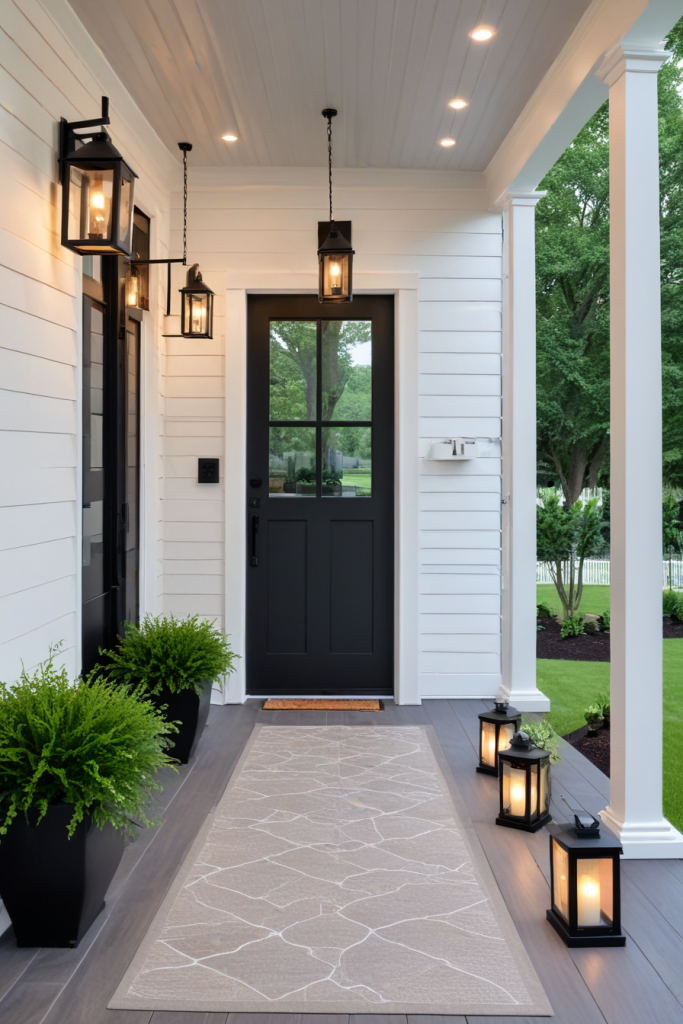 By adding soft pillows, comfortable seating, and gentle lights, your front porch can turn into an inviting oasis. Prioritizing the comfort level of the seating, along with the zoning color scheme, makes the place calm and serves as a quiet outdoor escape, not forgetting to mention, the contemporary design standard.