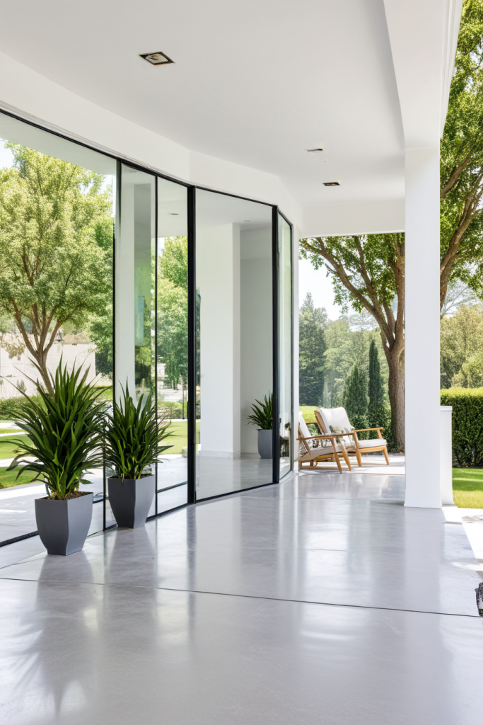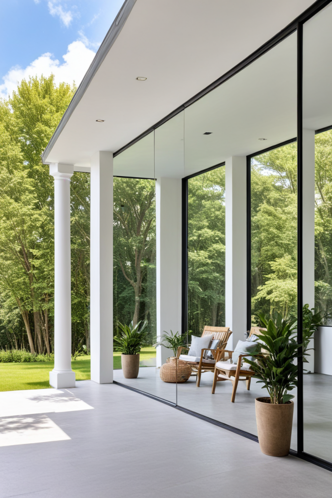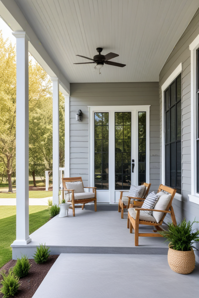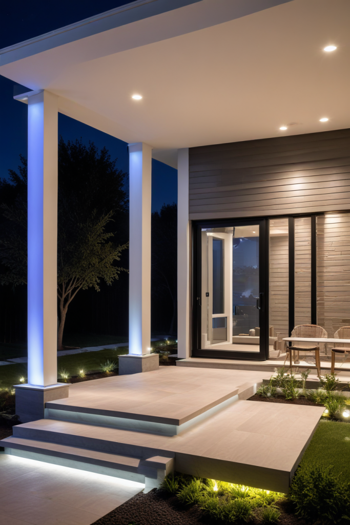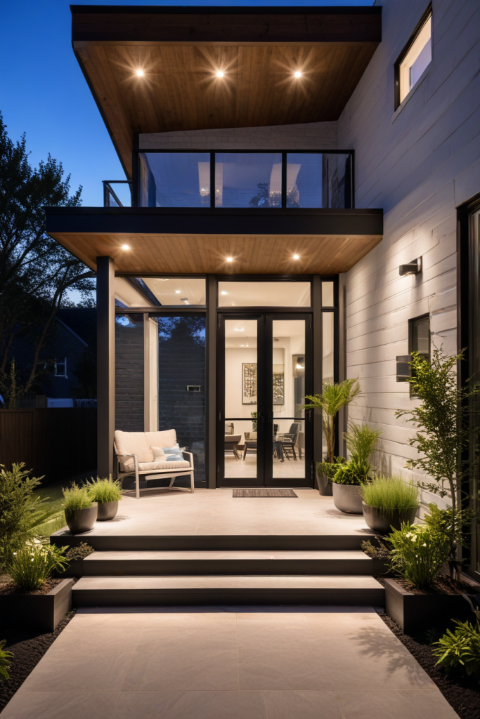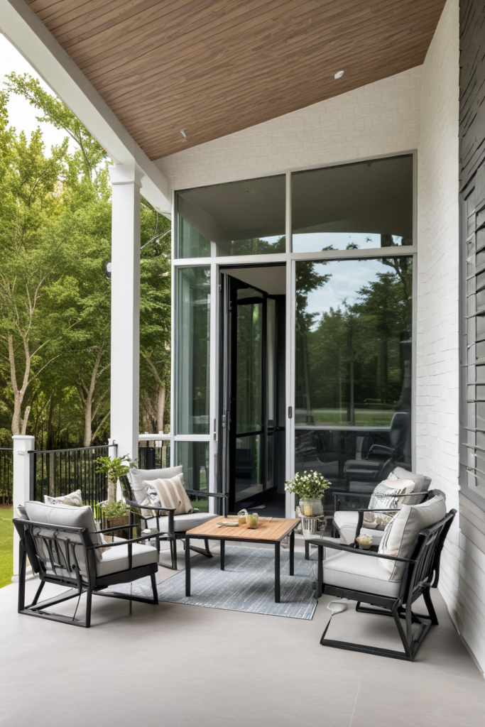 Modern security and convenience can be accomplished by merging smart technology into the design. The contemporary porch beautifully integrates features such as smart lighting, automatic door locks, and hidden sensors without any compromise to style or function.