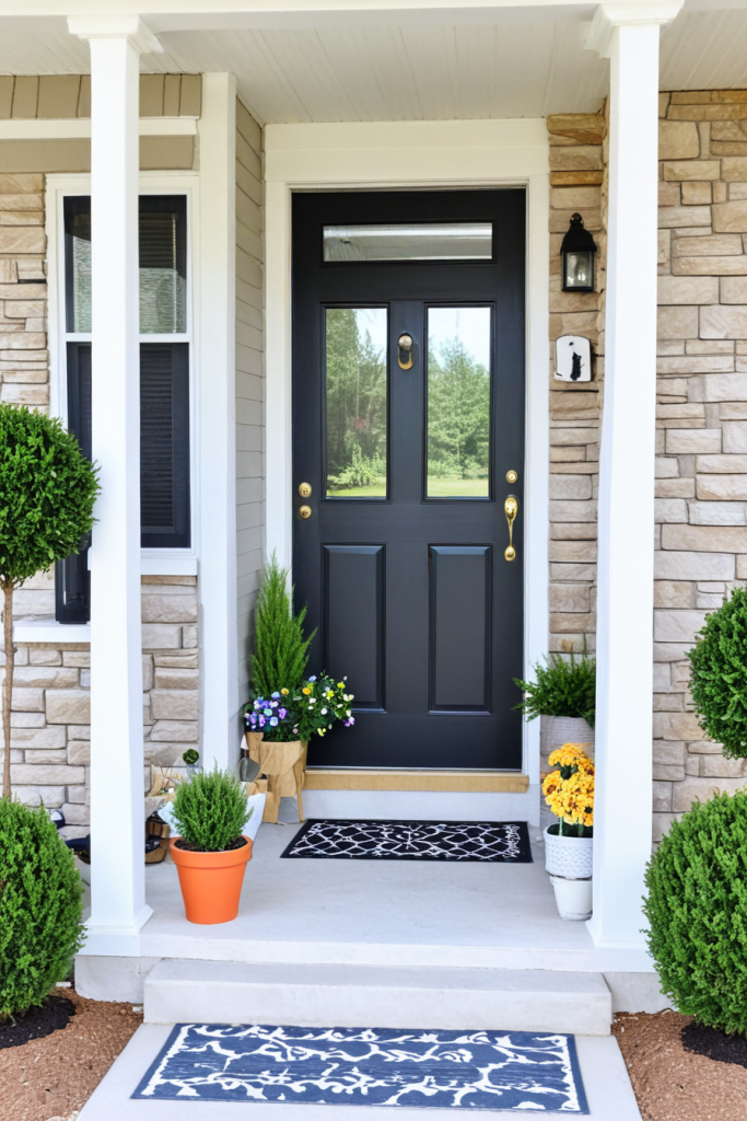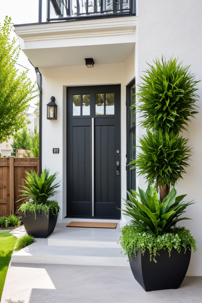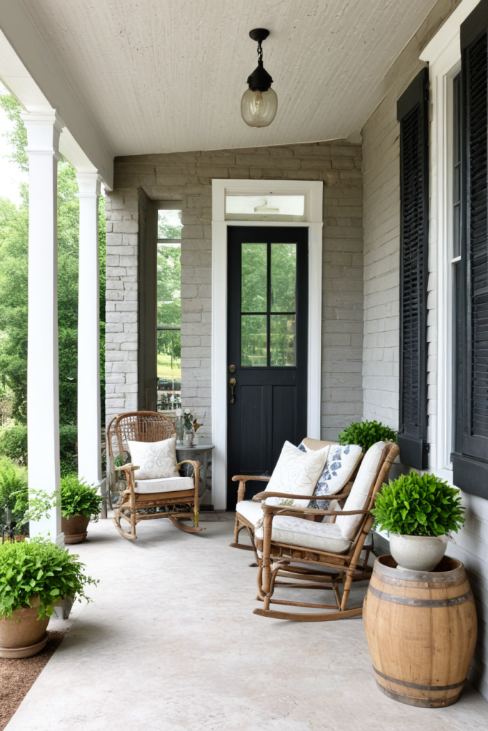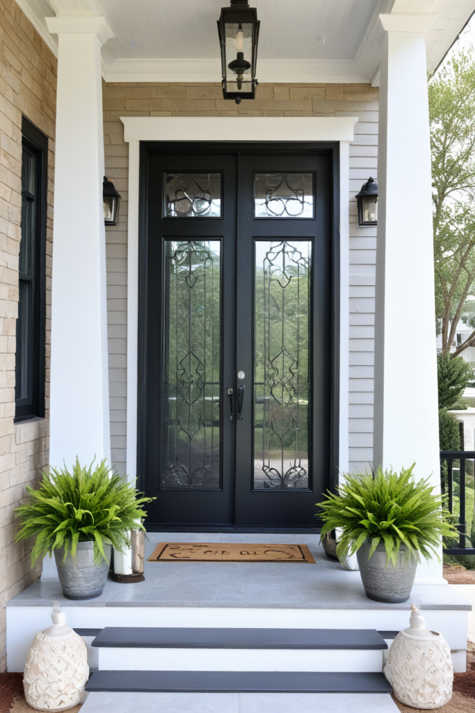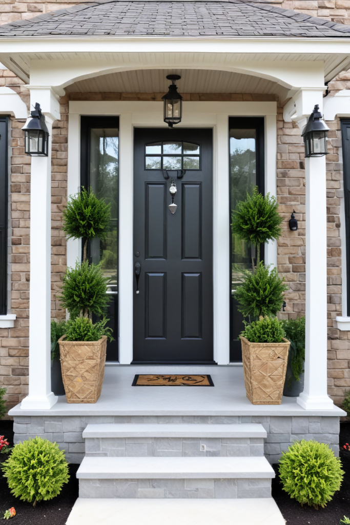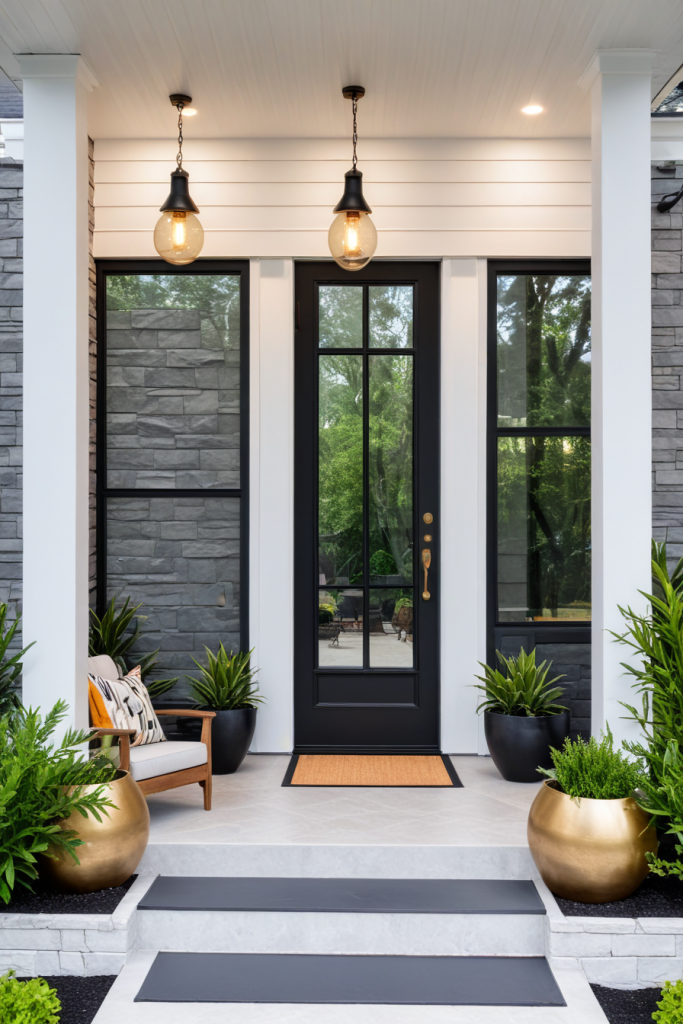 Identify easy ways to add nature to your porch by incorporating sleek pots brimming with plants to add life to it. Modernized potted plants and ornamental greens beautify porches while offering a refreshing contrast to the stonework’s severity, achieving an inviting and stylish outdoor aesthetic.