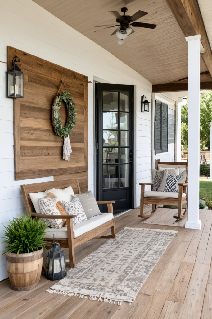 Add to your entryway with a welcoming touch using natural wood, subtle vintage decor, and distressed finishes that work together seamlessly. Incorporating reclaimed wood furnishings, warm textiles, and soft lighting provides comfort in a small space – all qualities that make it an ideal fit for a front porch.