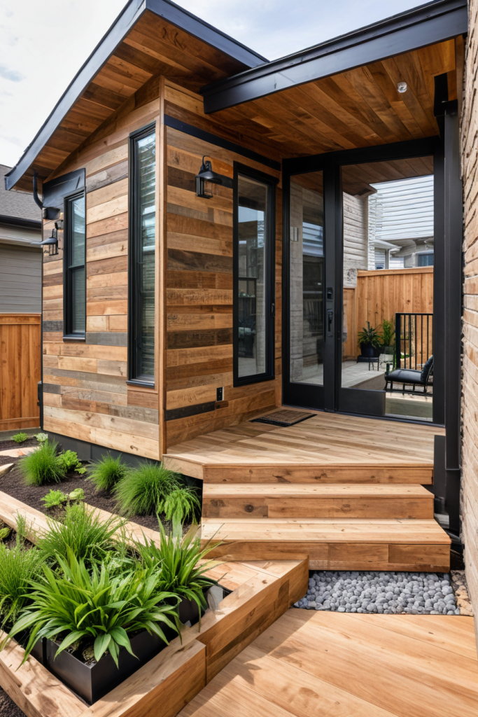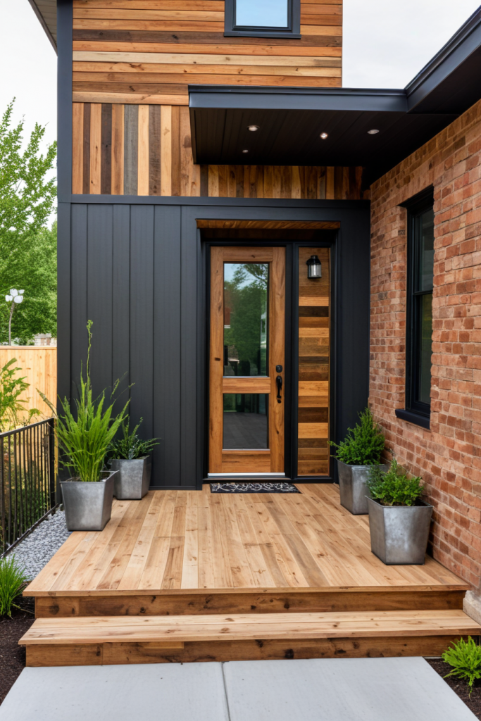 Build a modern design of the porch using eco-friendly materials which complement the aesthetic of the house. An entryway with style is created through reclaimed wood with reused metals and energy saving fixtures as they merge modern style with contemporary sustainable living.