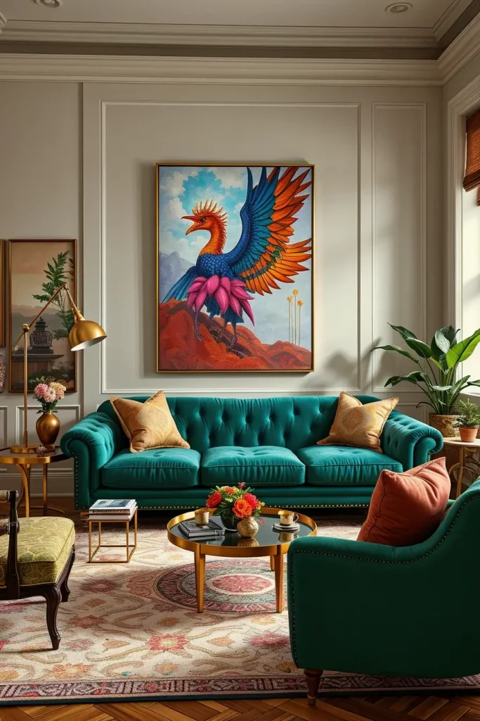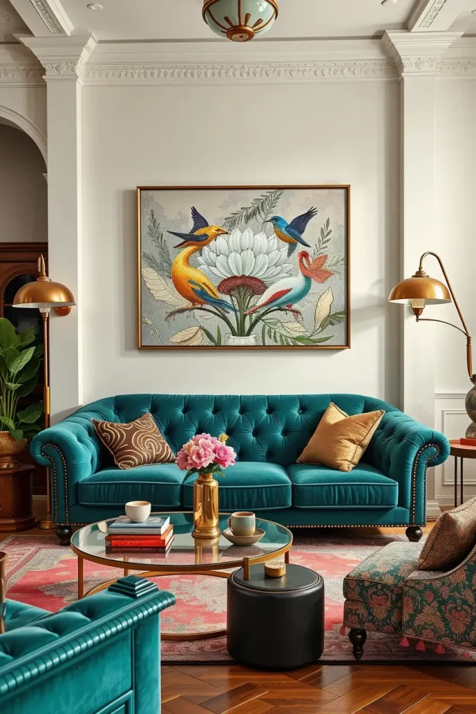 These colors are supplemented with the help of colorful fabrics, including velvet or chenille. Personally, I prefer matching bold sofas with neutral walls, or black-framed artwork, or brass accent lamp, in order to create a striking visual balance.