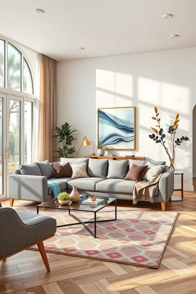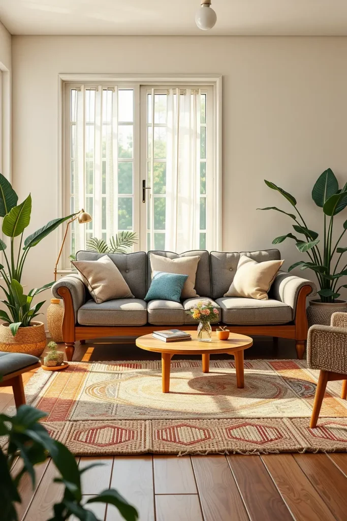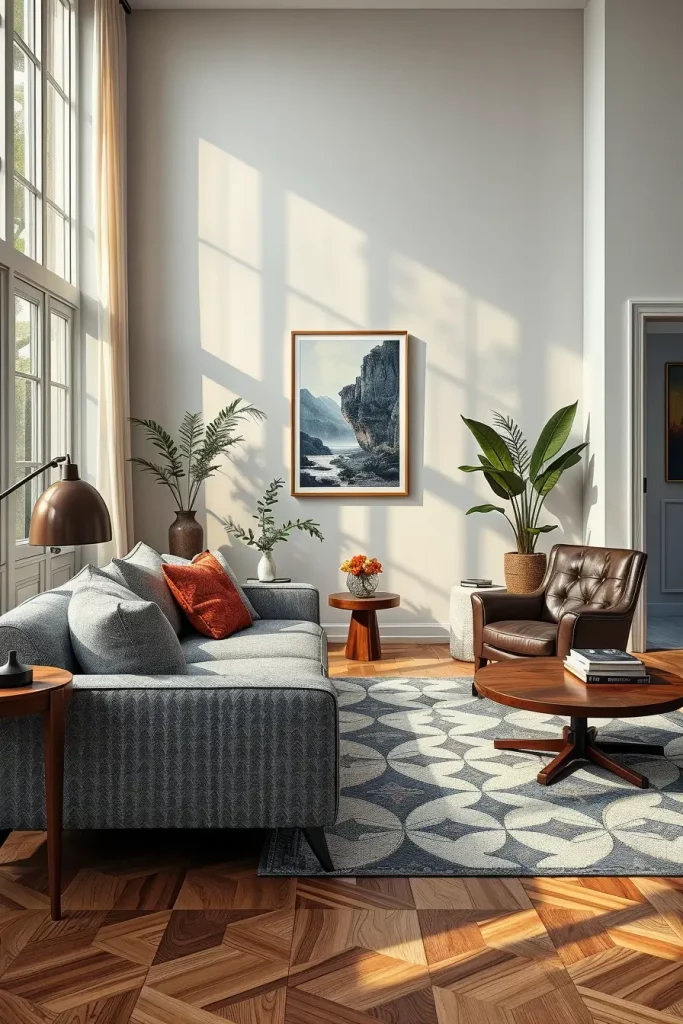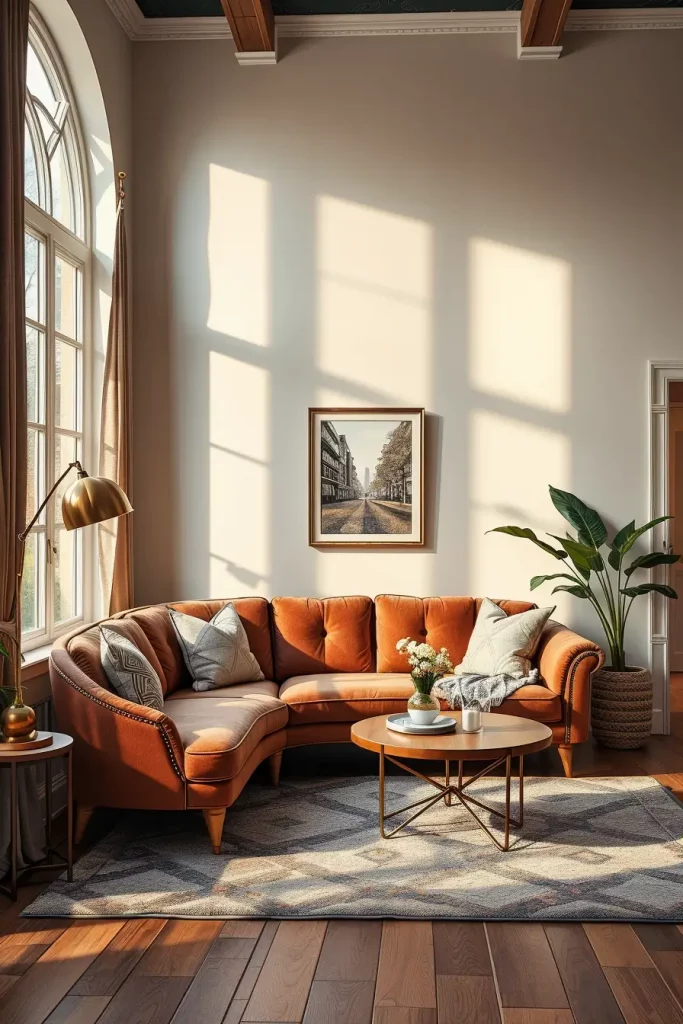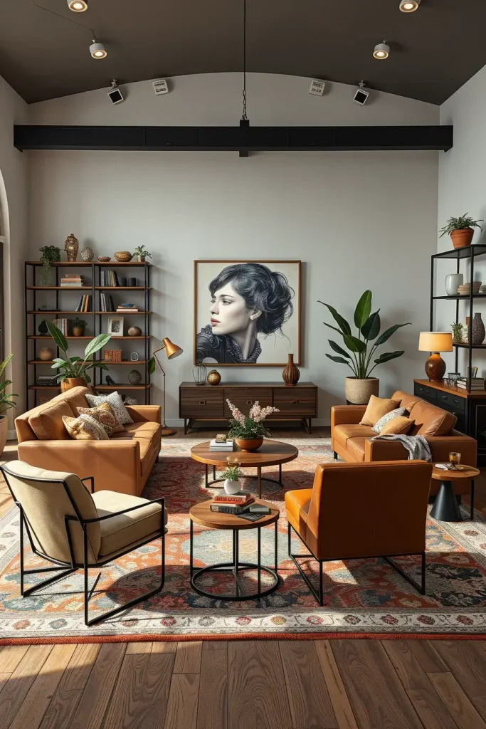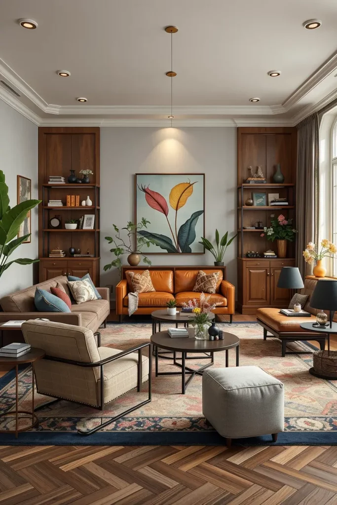 In order to establish balance, I would suggest retro sofas that would be matched with smooth coffee tables, geometric carpets, and metallic floor lamps. This juxtaposition is a transition between the old and the new and makes the space modern yet without losing its appeal.