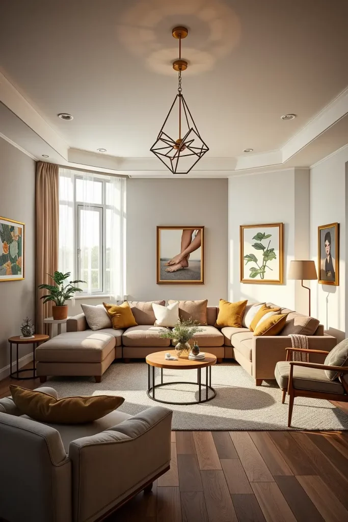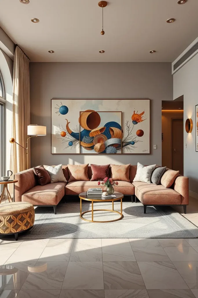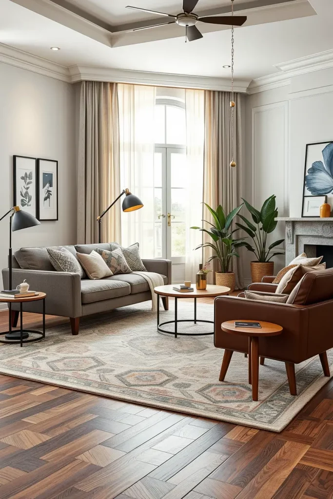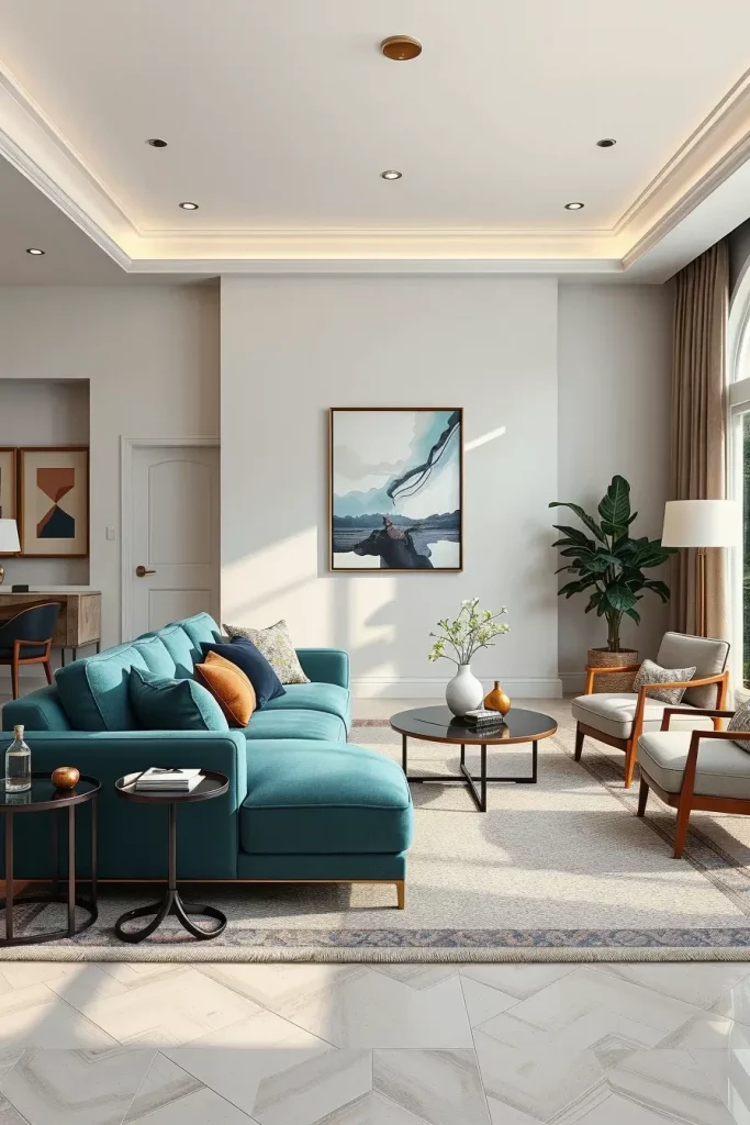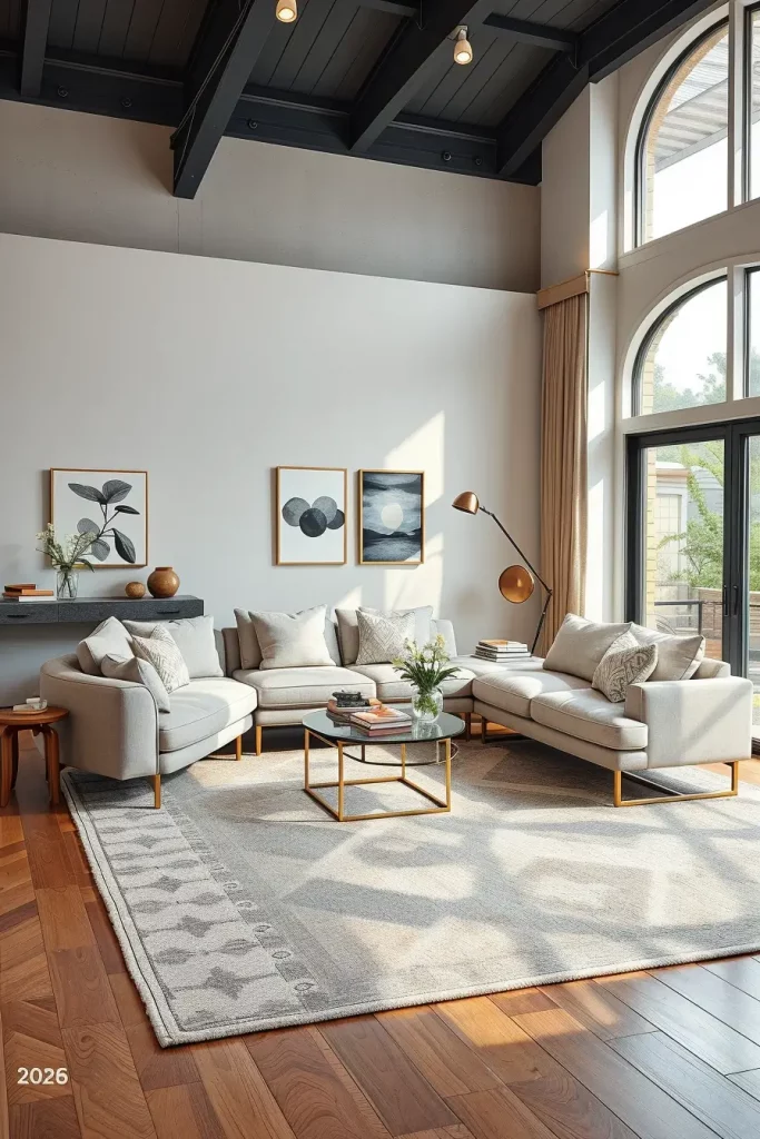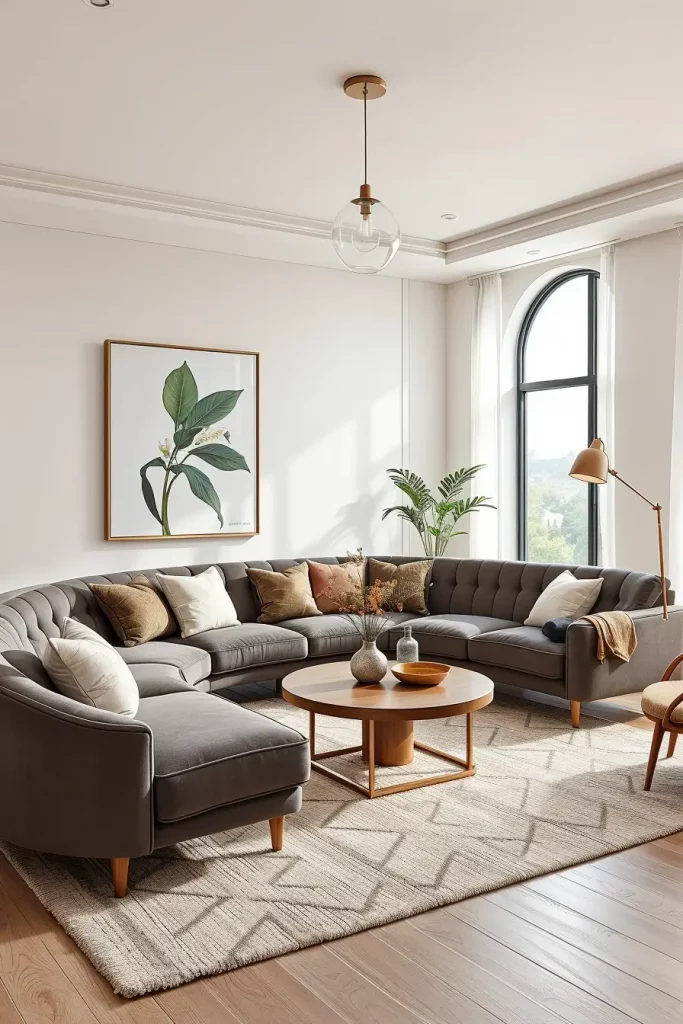 In order to establish balance, I would suggest retro sofas that would be matched with smooth coffee tables, geometric carpets, and metallic floor lamps. This juxtaposition is a transition between the old and the new and makes the space modern yet without losing its appeal.