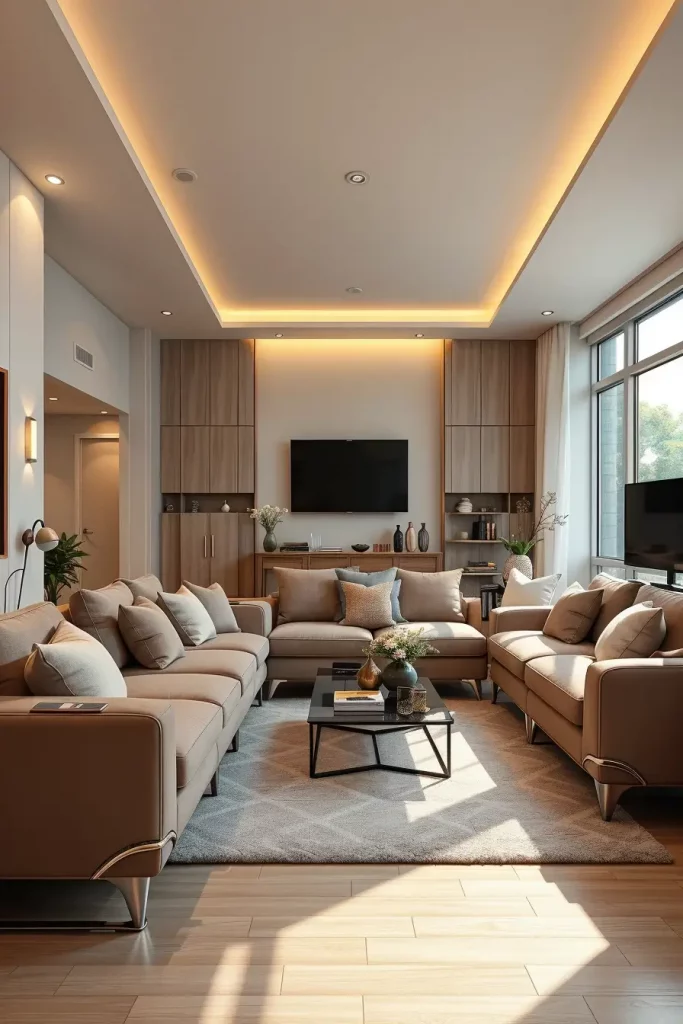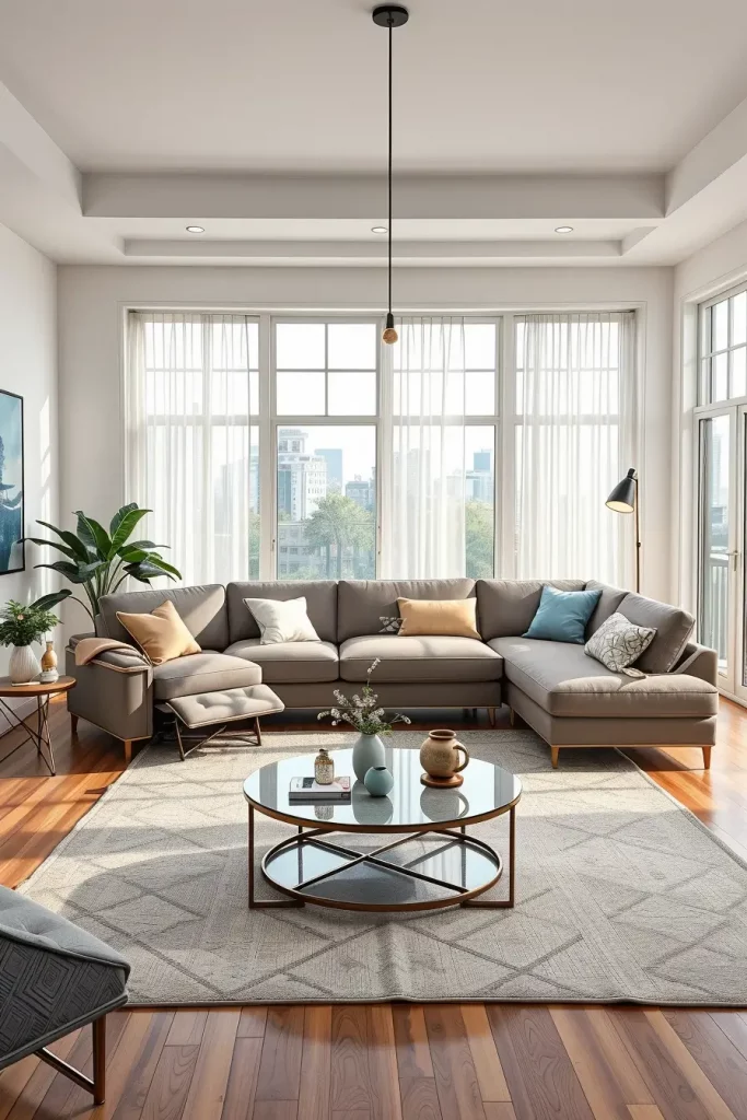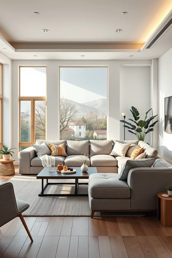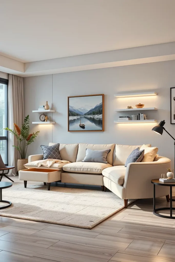 Among the features that I would always want to consider when choosing an ergonomic sofa includes adjustable headrests, modular, and embedded lumbar support. The combination of these and a few side tables that are low-profile, a coffee table with a low profile, and ambient lighting in the form of LED lights makes the room inviting and functional. The neutral soft upholstery decision, which can be thought taupe, gray, or dull olive, adds to the peaceful impression, and the metallic leg brings attitude to the future.