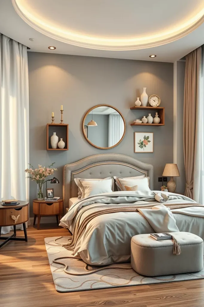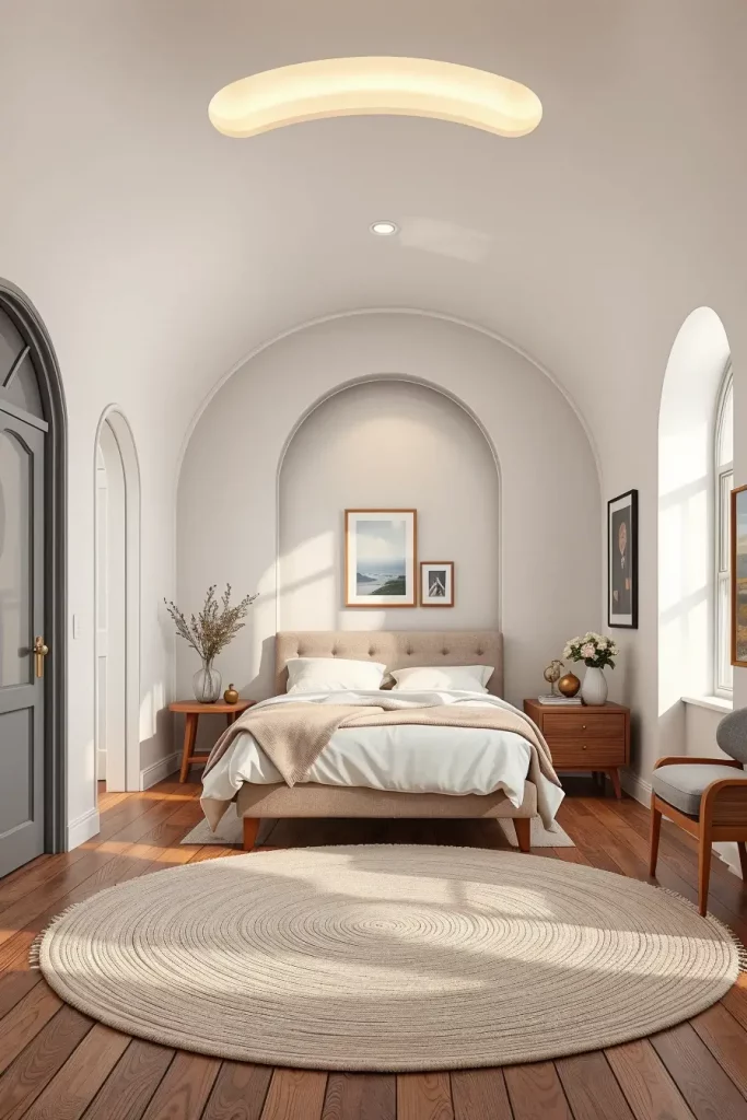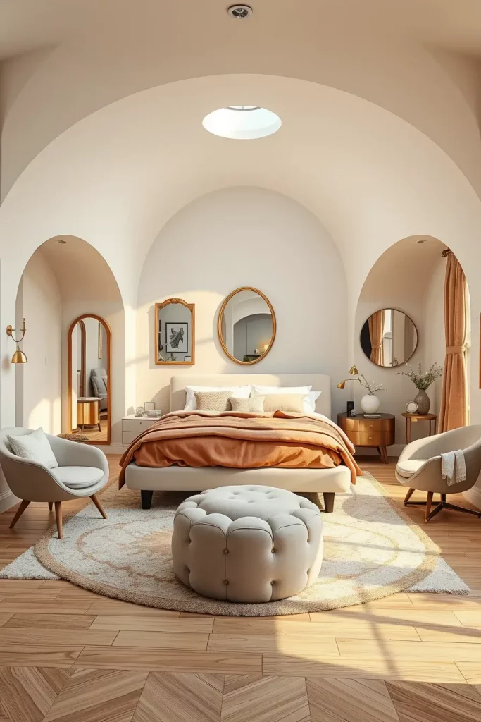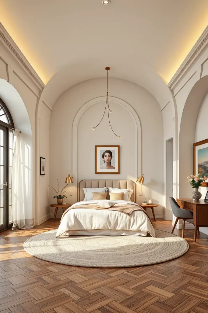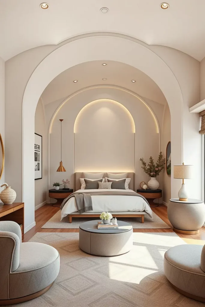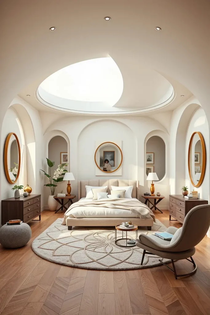 In the case of furniture, I would prefer a rounded chaise lounge, a curved upholstered bench at the foot of the bed and softly draped curtains that would reflect the flowing lines of the room. Other decorative details include a rounded statement mirror with a gilded frame or circular glass pendant lights that add to the elegance without being too fancy.