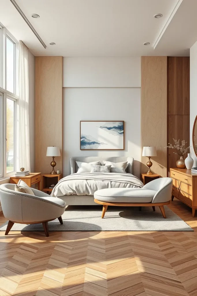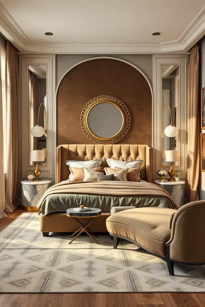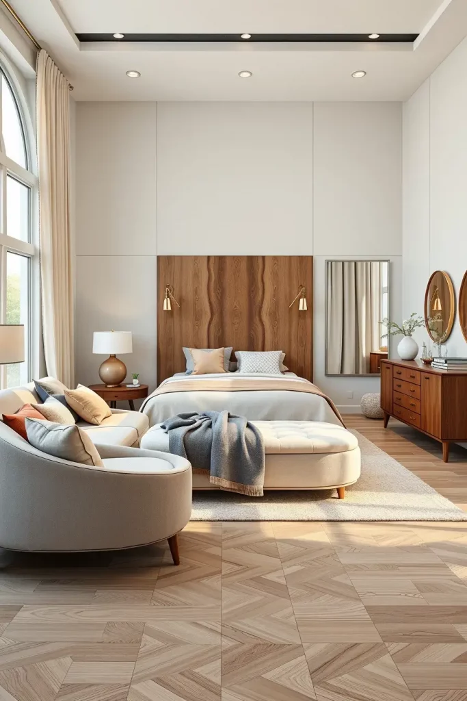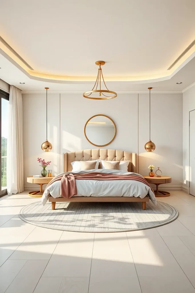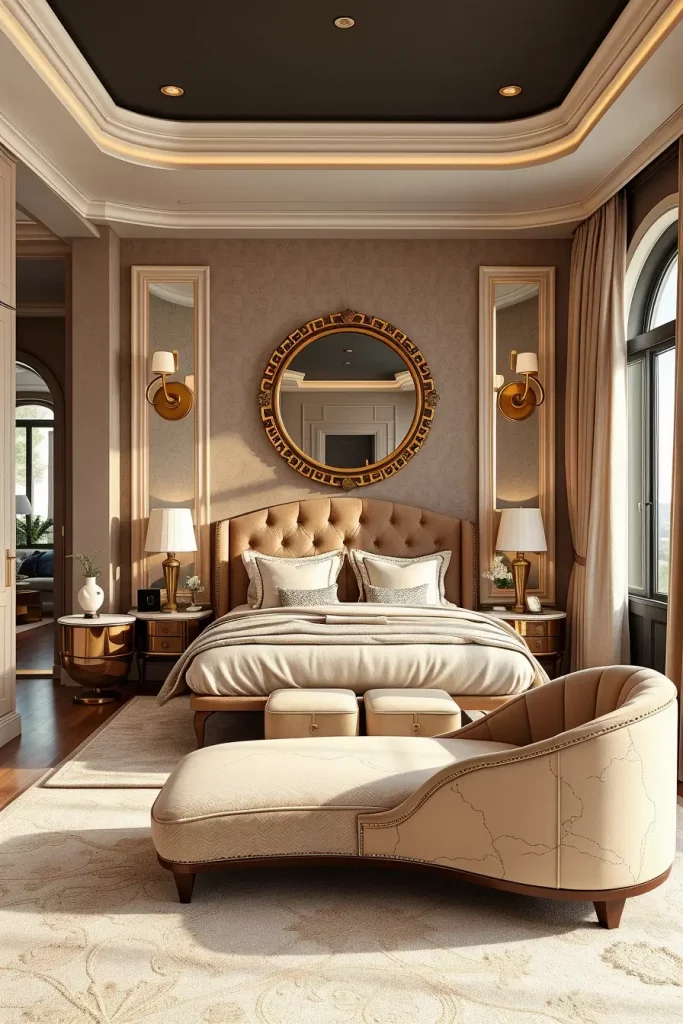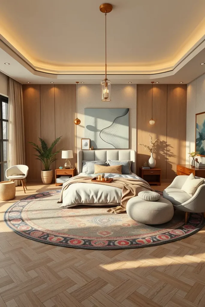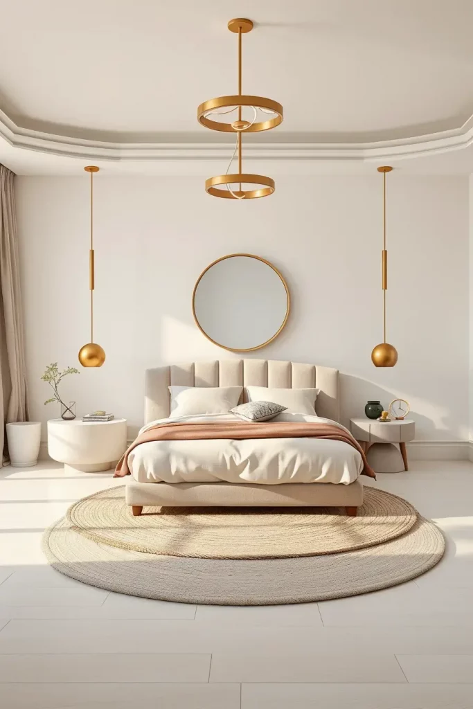 In the case of furniture, I would prefer a rounded chaise lounge, a curved upholstered bench at the foot of the bed and softly draped curtains that would reflect the flowing lines of the room. Other decorative details include a rounded statement mirror with a gilded frame or circular glass pendant lights that add to the elegance without being too fancy.