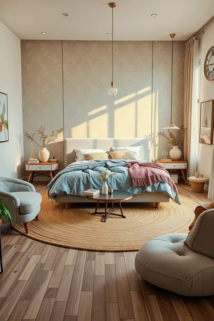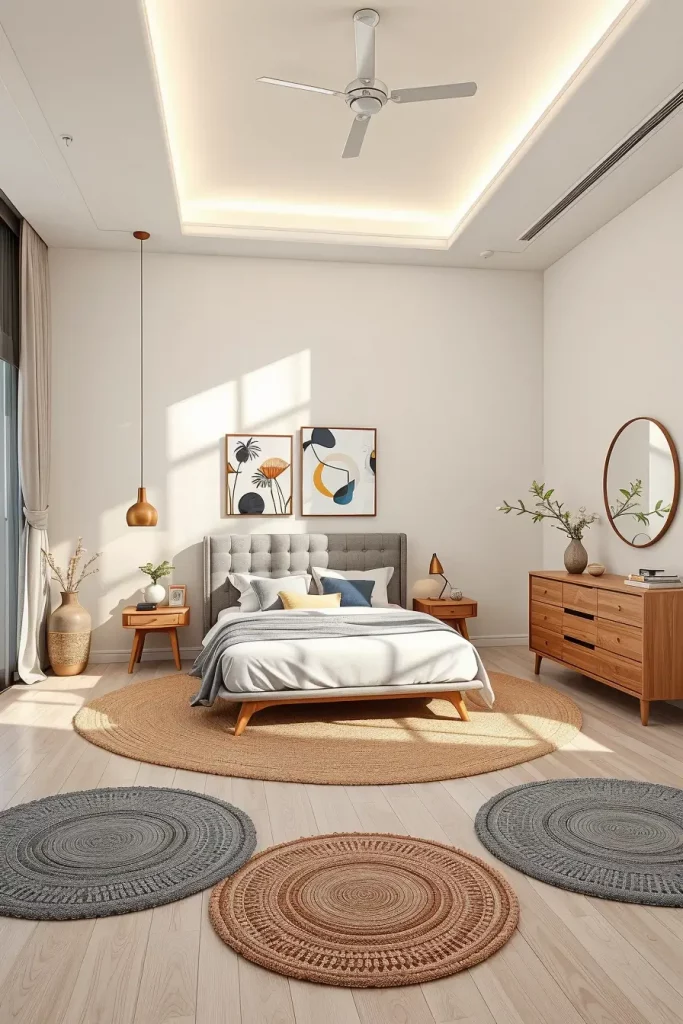 One of my favorite grounding tools to use in a bedroom layout is a circular rug. It attracts everything to its center, and this makes it have a natural flow that rectangular rugs cannot achieve.