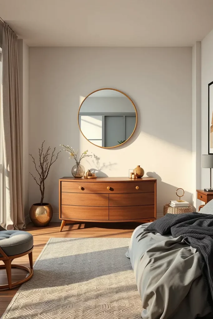 To finish the idea, I would hang a round mirror above the dresser, which would unite the visual theme.