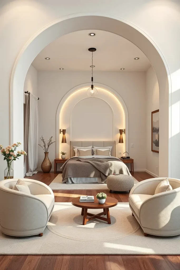 I have done rooms with arches that were used as a room divider but in a subtle manner and framing the bed area but still having an open flow. An arch painted in a shade a little warmer or cooler than the walls of the room will be a very effective focal point.