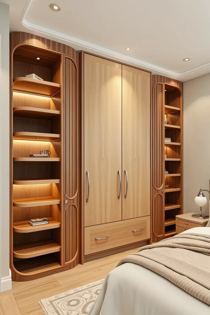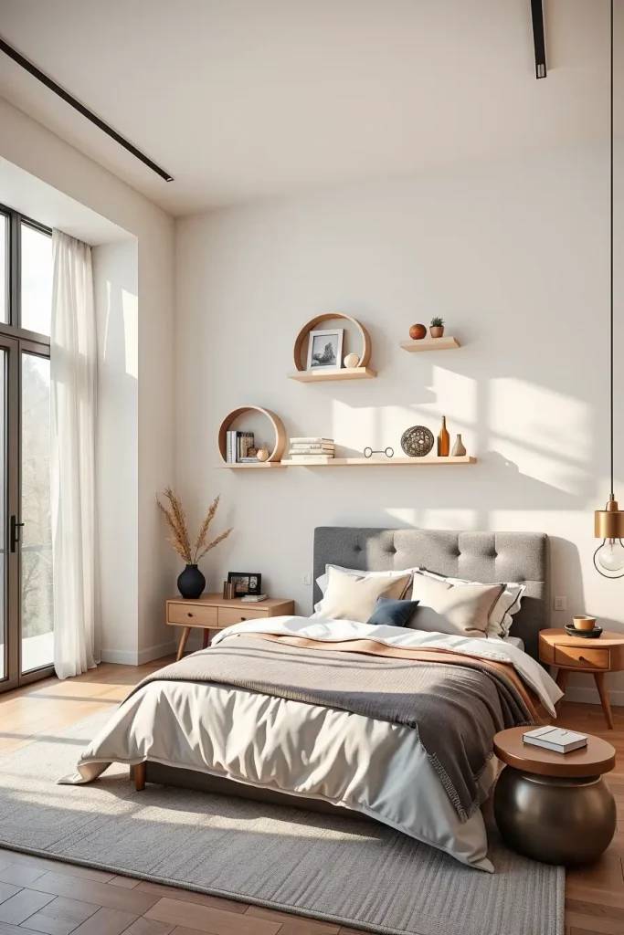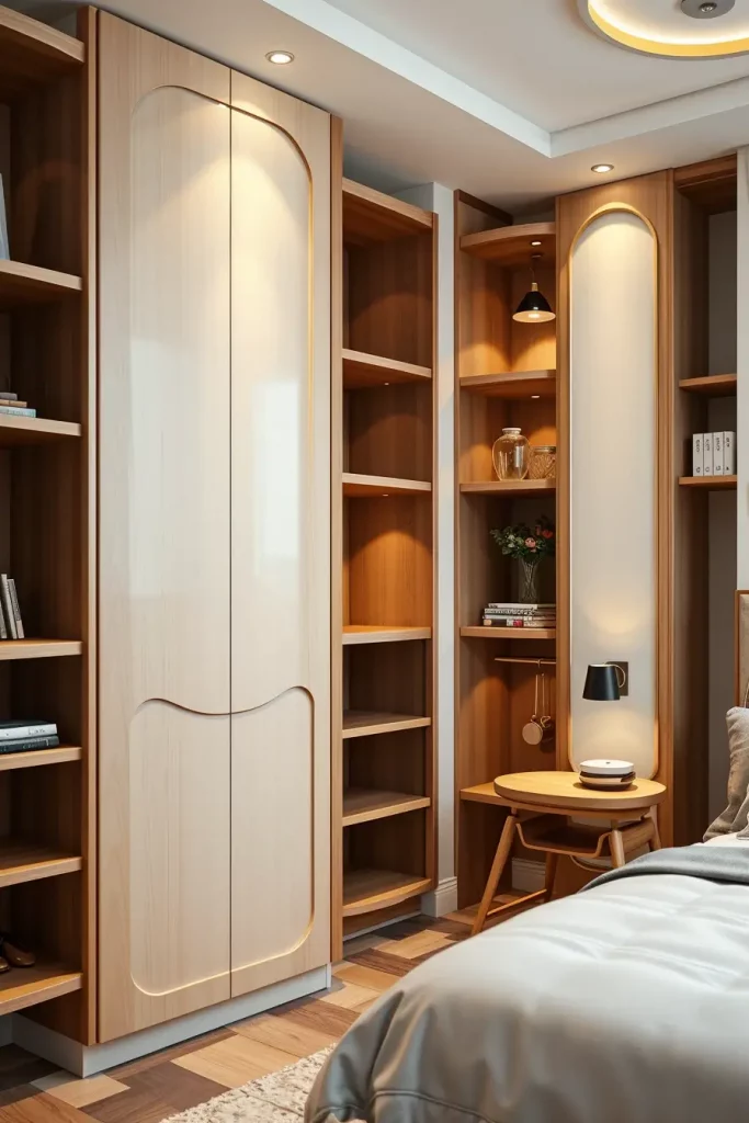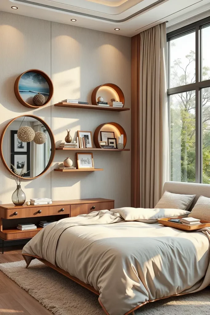 It is not necessary that storage solutions should be straight lines. Curved shelving is functional and stylish, which makes the bedroom less intimidating.