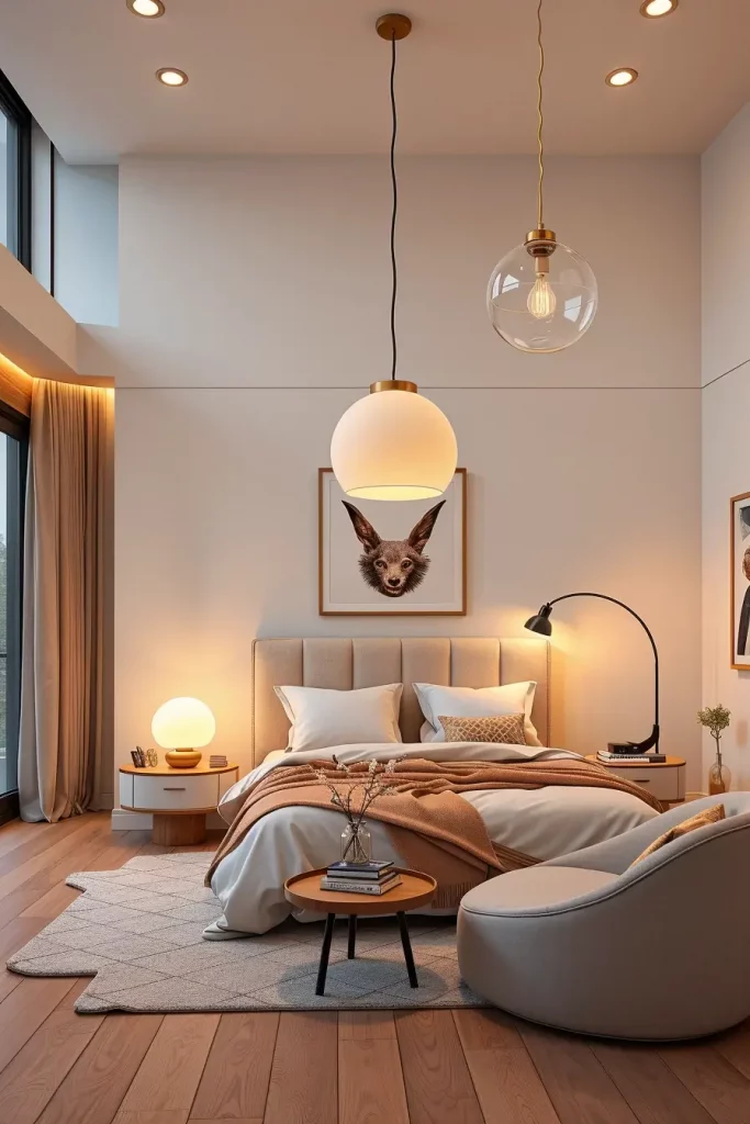To further improve this arrangement I would incorporate curved wall sconces or pendant lights on either side of the bed, but not too many to make the place look overcrowded.