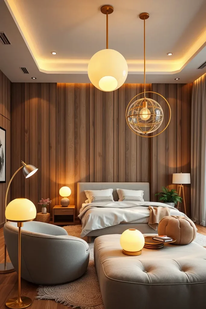 Globe pendant lights, dome-shaped table lamps, or arc floor lamps are some of the most common light fixtures I prefer to use in bedrooms where I need to achieve a relaxing atmosphere. The fixture shape is in line with other curved features so that no element seems out of place.