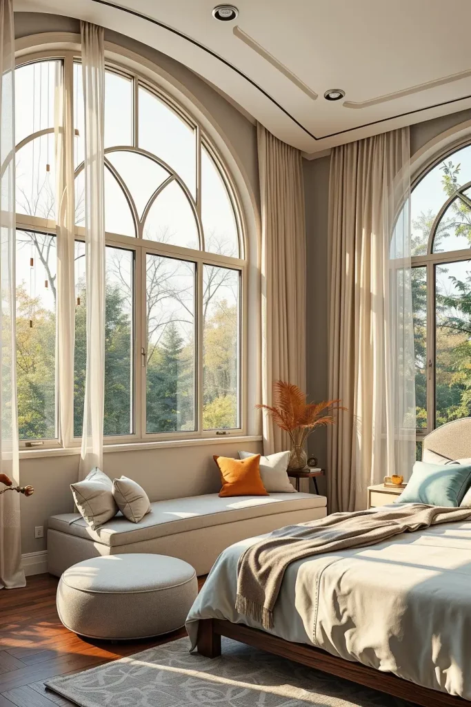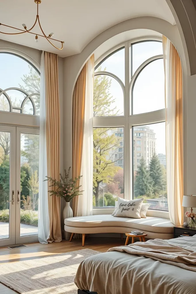 Curved windows immediately make a bedroom unique, providing an architectural element that attracts light but is still soft. They become a continuous flow when combined with curved drapery rods and feel purposeful and classy.