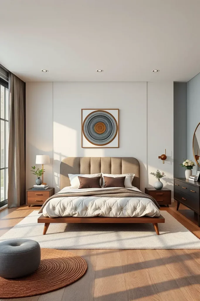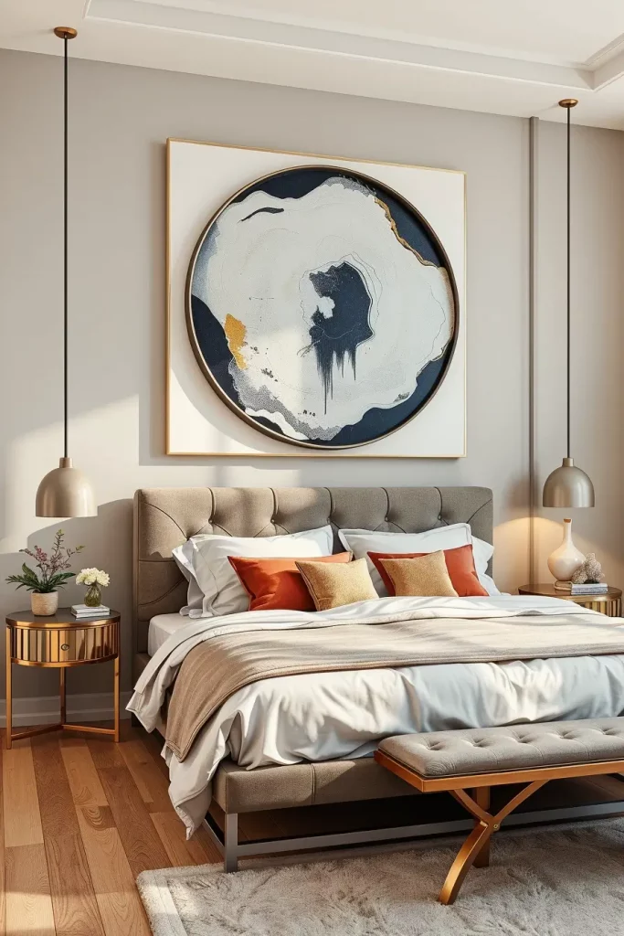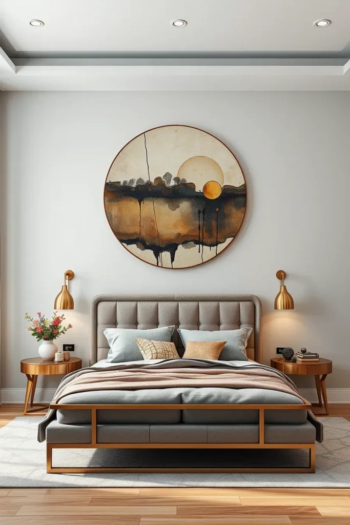 I like pieces that are muted in color or abstract in form so that it does not dominate the bedroom. Wooden or metallic large frames may be used to provide an additional layer of sophistication and keep the round shape.