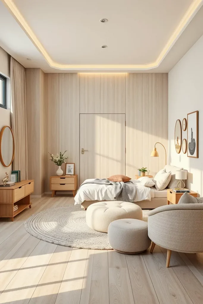 Regarding furniture, I choose a low profile bed frame and an upholstered curved headboard to be both comfortable and stylish. I include round poufs or ottomans, and I like circular pendants lights more than angular ones. The rug can even contribute to it, a round or oval shape is a slight reinforcement of the theme, but it does not take over the room. The off-white, beige, and light gray color palettes make the look cohesive.