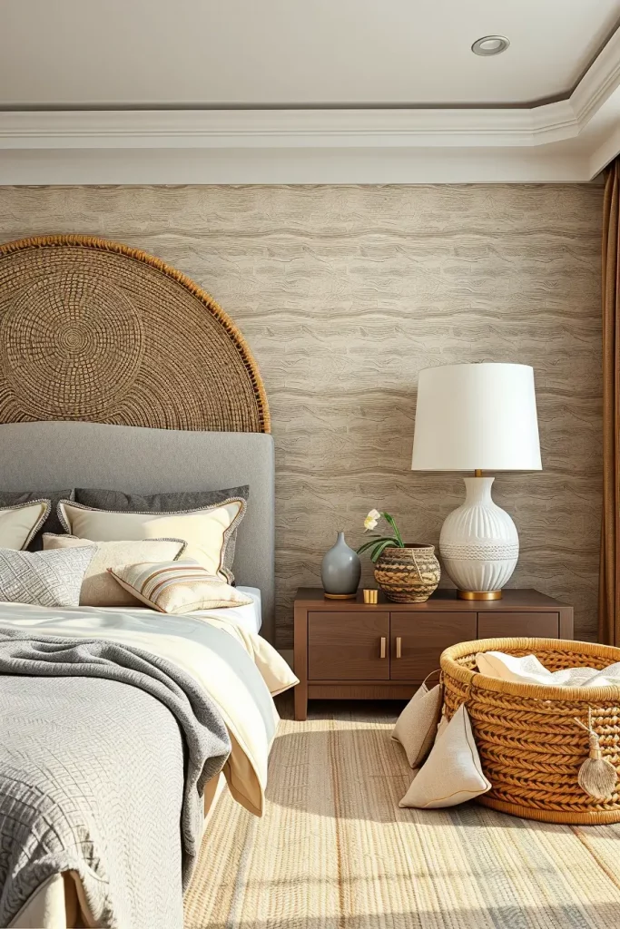 To complete this part, I would include a big, round woven wall decoration above the bed with a bold but natural touch.