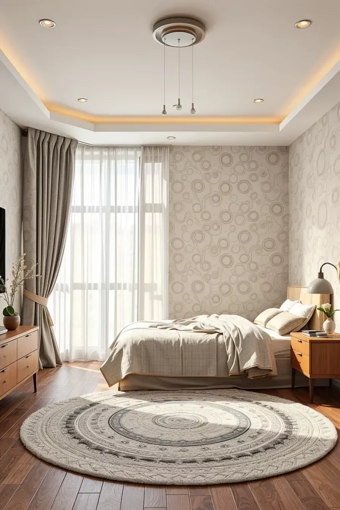 One of my most favorite things to add movement and softness to a bedroom without over-furnishing it is to introduce circular patterns in wallpaper and textiles. I usually prefer wallpapers with faint, repetitive circles or arcs which blend with the overall color scheme of the room. These patterns can be used intelligently to make walls appear more active and yet maintain the environment restful.