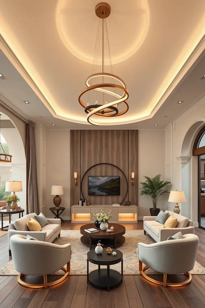 Ones I like are ribbon-shaped pendant, round alabaster sconces, or the spiral chandeliers. I select the ones using warm LEDs to keep the tone at a relaxed pace. When fitted over a rounded table or by a curved doorway, these lights bring in drama and still remain unified with the rest of the room overall theme.