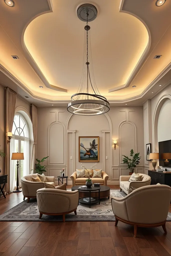The use of lighting is an effective storytelling system in any room. With a curvy living room, I would always use lighting installed with swirly or organic shapes. These designs carry on that feeling of flow giving the ceiling their own interesting shadows and thus does not feel tacked on.