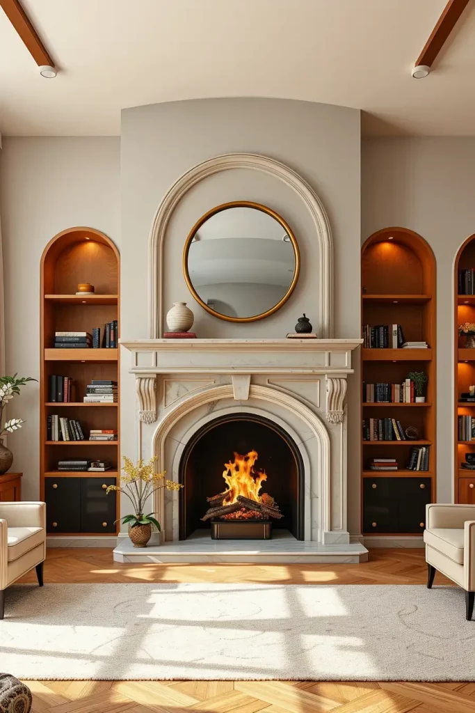 I would say to choose rounded mantel shelf or bowed face surround in such materials as marble or reclaimed wood. A curving arch lintel on the fireplace; decorative or structural, the drawing of the eye up in a flowing motion. All these things bring harmony and even more so when they are repeated in other curved pieces of furniture in the room.