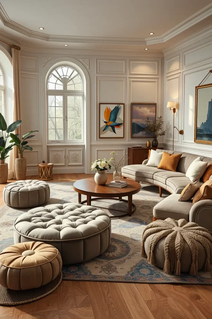 With my work when I am designing my own projects I prefer to use oval ottomans in velvet or boucle to add some luxury. Circular or cylindrical poufs constituting handwoven fabrics can also be used as footstools or an extra seating power. They have no sharp edges, which is why they are ideal to use in family rooms or casual places.