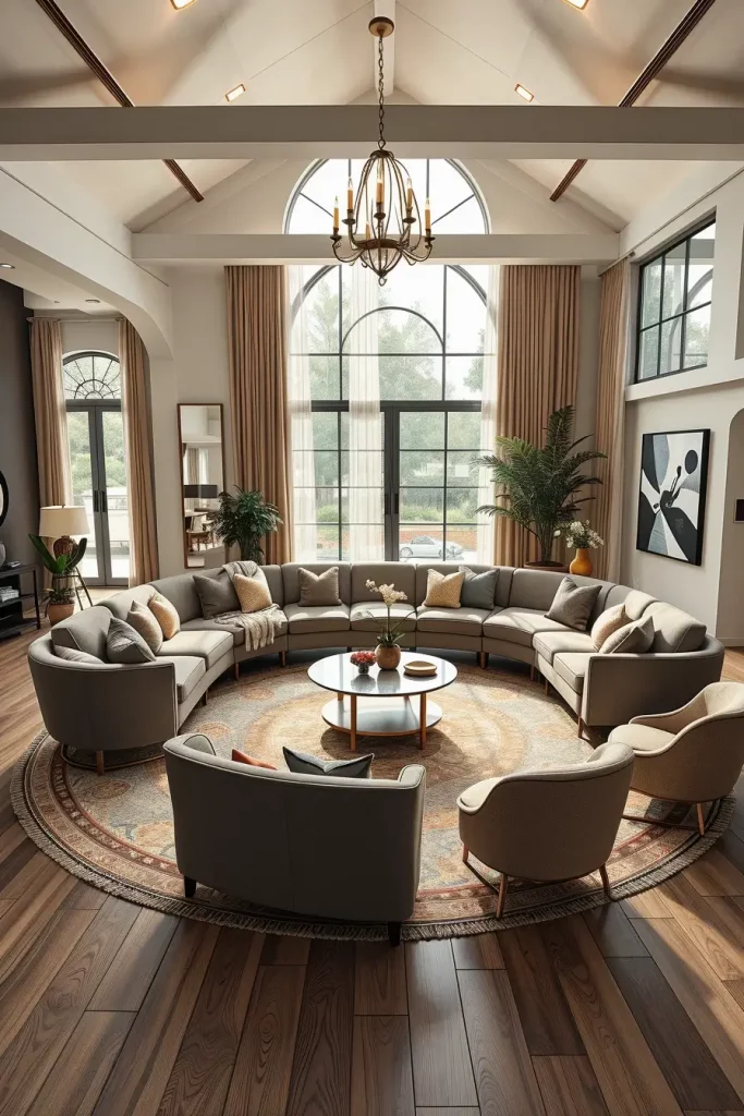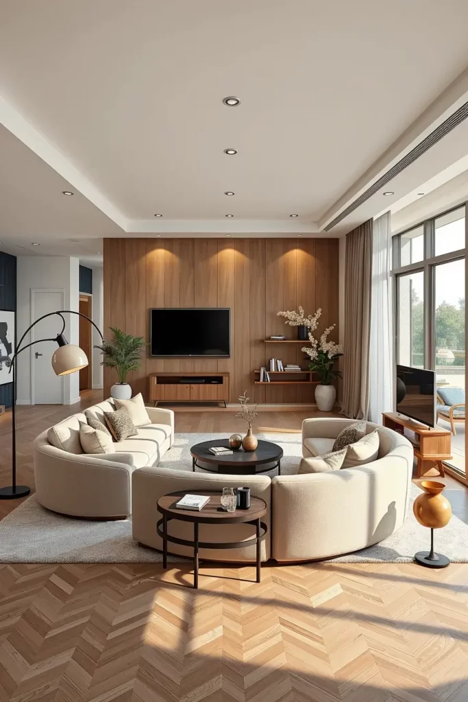 When I incorporate in the layout the curved elements, I prefer round-shaped sectionals in modular form, crescent-shaped rugs, arced floor lamps as sources of ambient light that frame the space instead of dividing it. These devices make the traffic flow gentler and exclude gaps that are prevalent in a square or a rectangular arrangement. A curved media console is a good option to obtain a visual flow and storage.