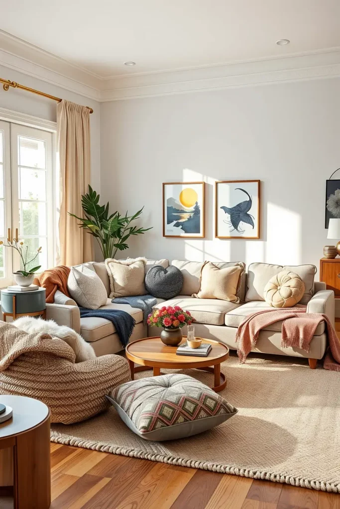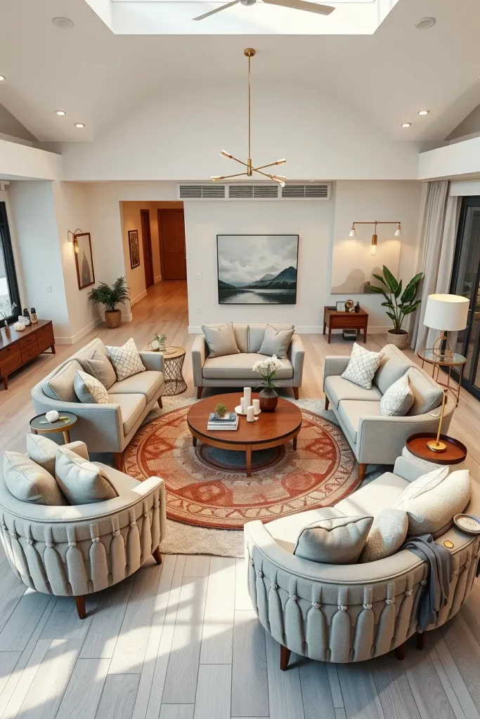 Instead of cramming all the furniture into the walls, I usually prefer circular furniture arrangements in the living rooms. This position brings the intimacy and flow, which makes the space look welcoming and multifaceted. Curved installation favours natural chat areas and gives the perception of space in the centre of the room.
