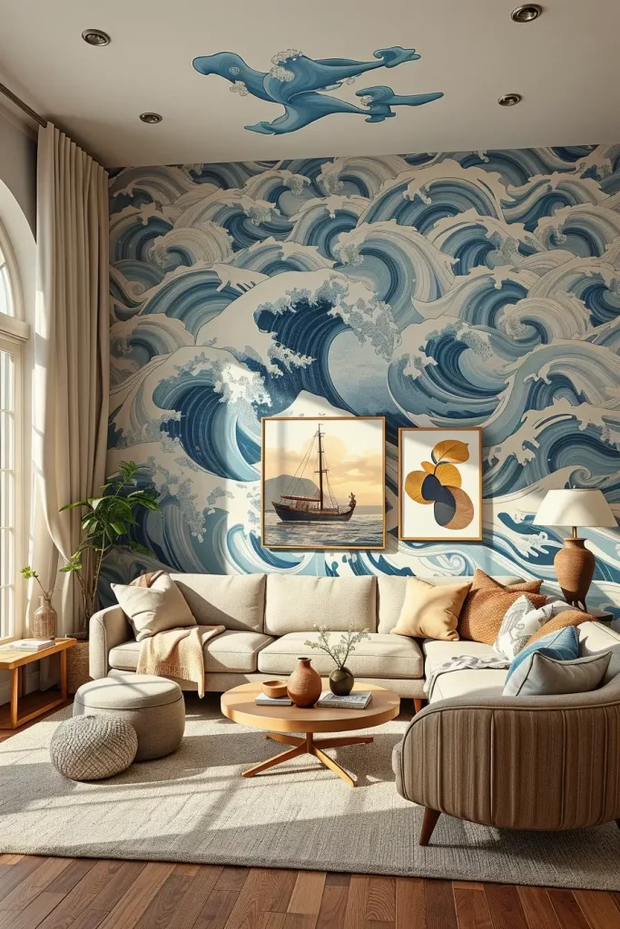 My instant ones are a wallpaper with either a large-scale print of waves or a mural that reproduces the rush of water with soft de-saturated colors. I like designs which cover whole walls to have maximum effect–such as behind a curved couch or near a bay window. Even the abstract forms of waves in metallic or matte can be incorporated into the murals to create the light reflection dimension.