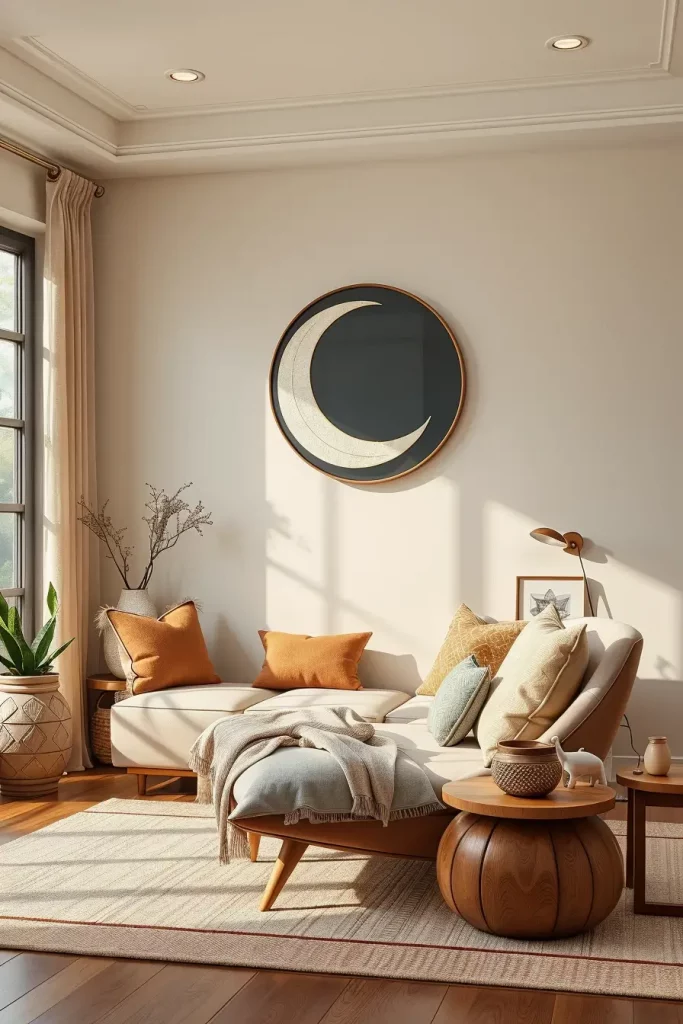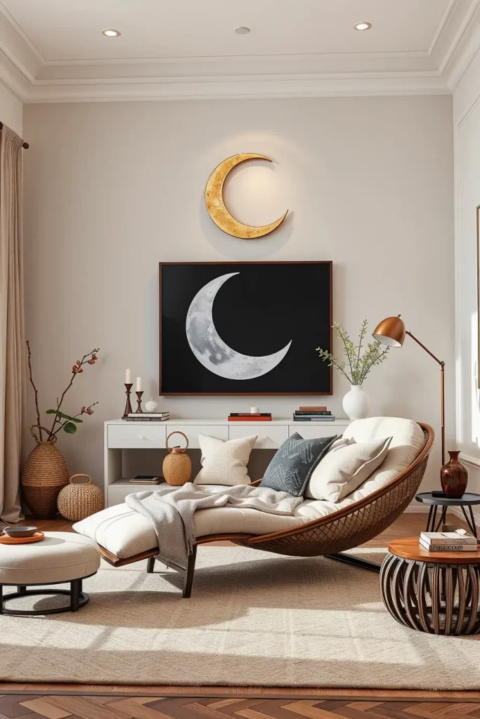 Personally, I have seen brass or matte black sculptures of crescent shapes are simply magnificent on white or dull colored walls. Canvas art with crescent shapes is also one of my favorites (either bride and abstract or tender and watercolor-like). Positioning is important, I prefer to build layers in a non-symmetrical arrangement with the curves fitting against the straight lines of windows and furniture.