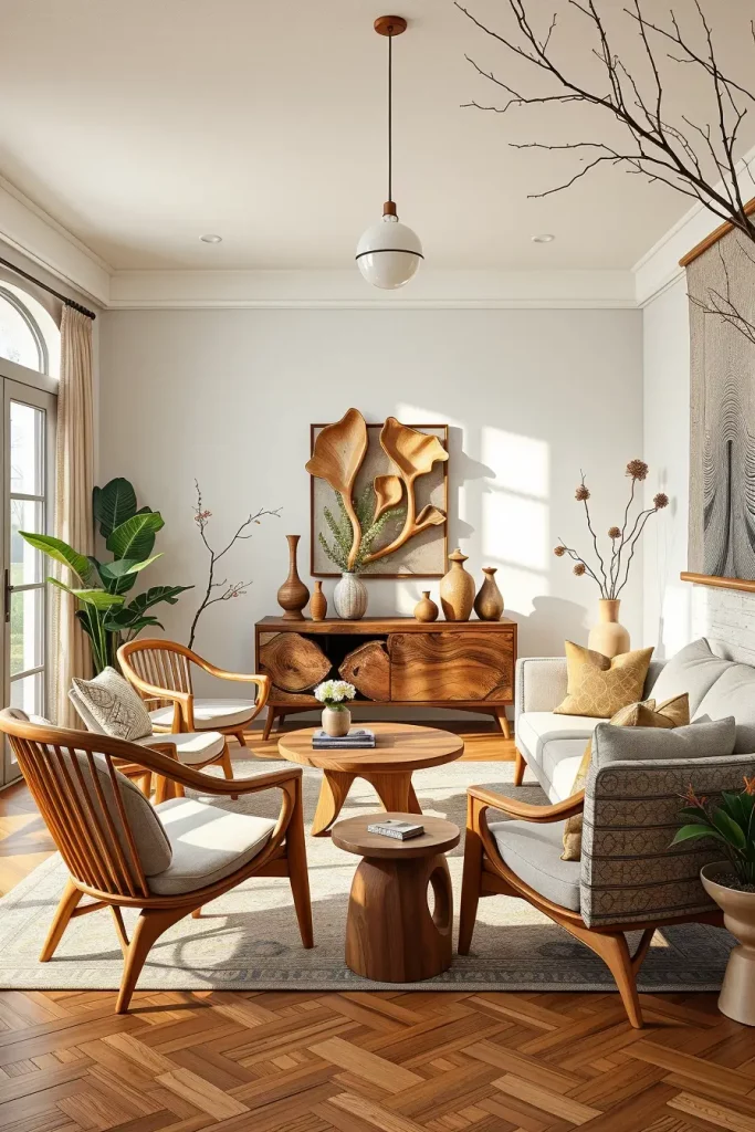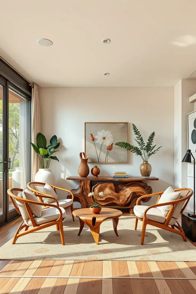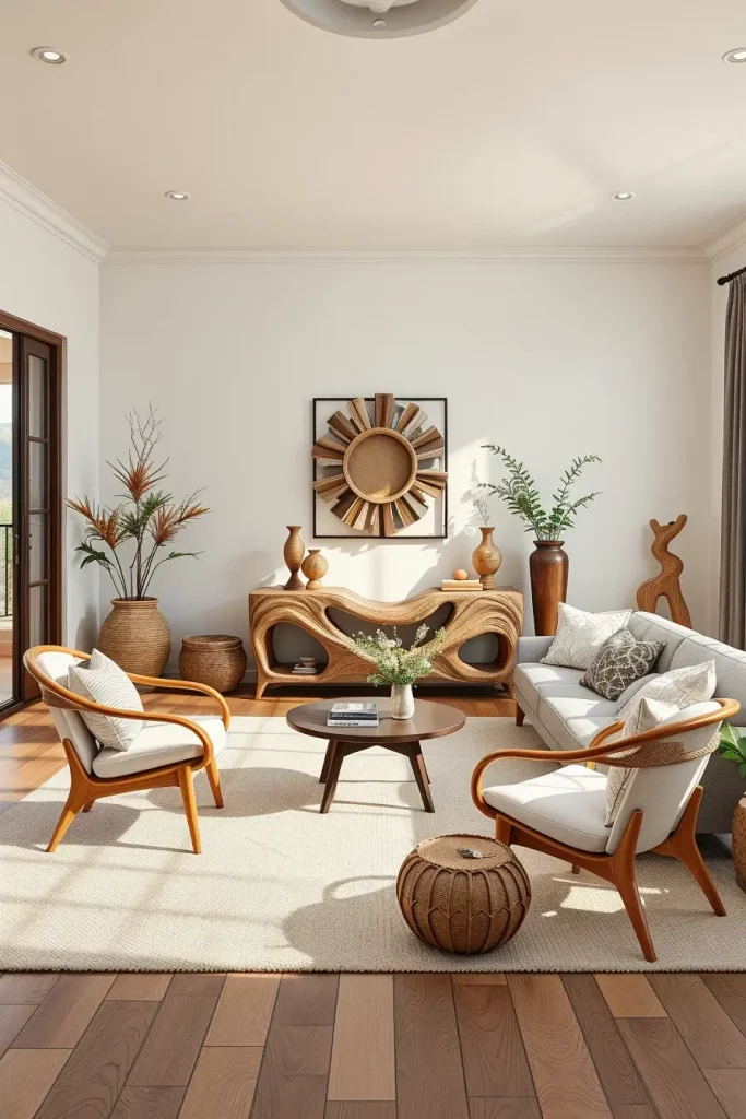 To further ensure the cohesion I would also combine bentwood items with curvy shelves or spherical wooden sculptures to add natural warmth and continuity to the room.